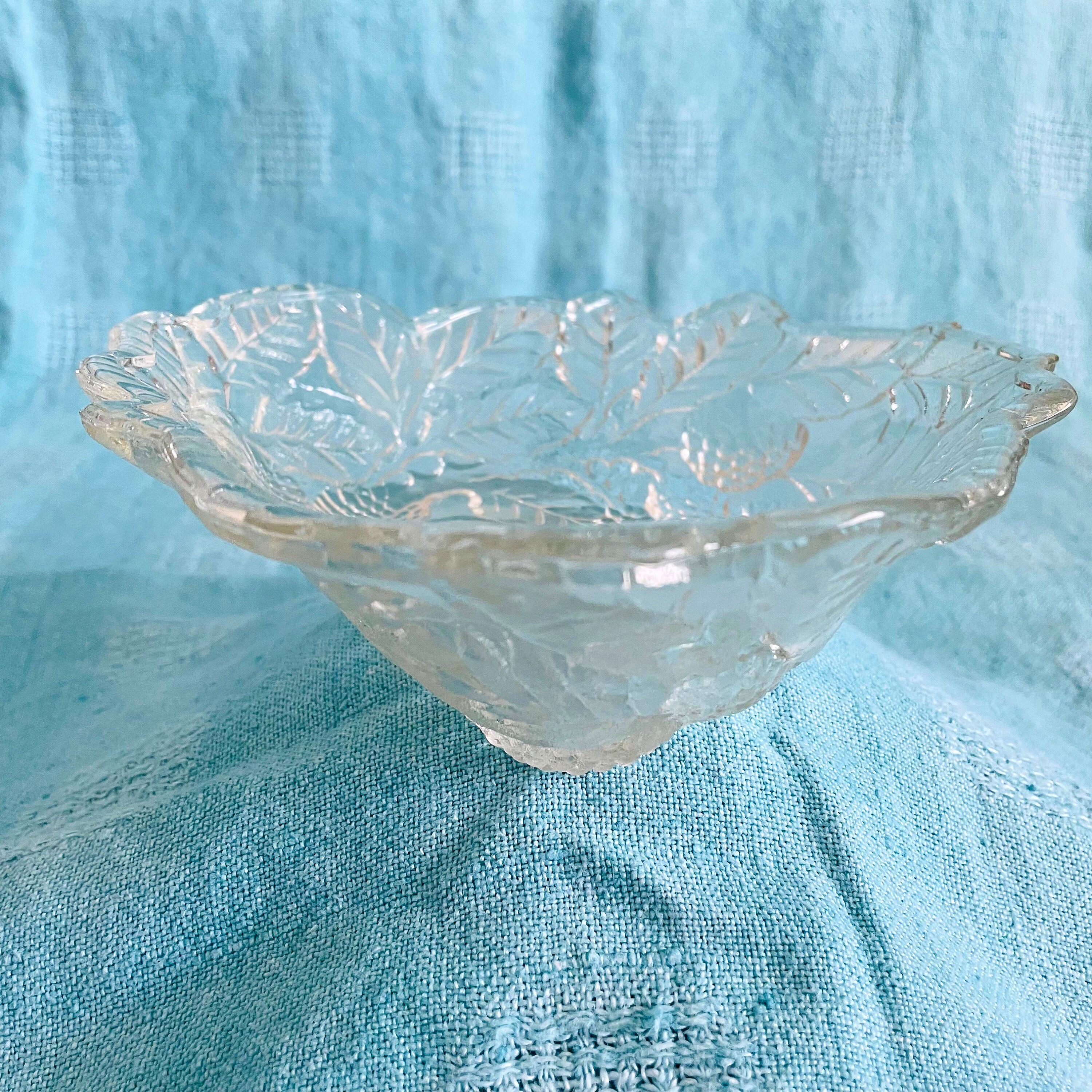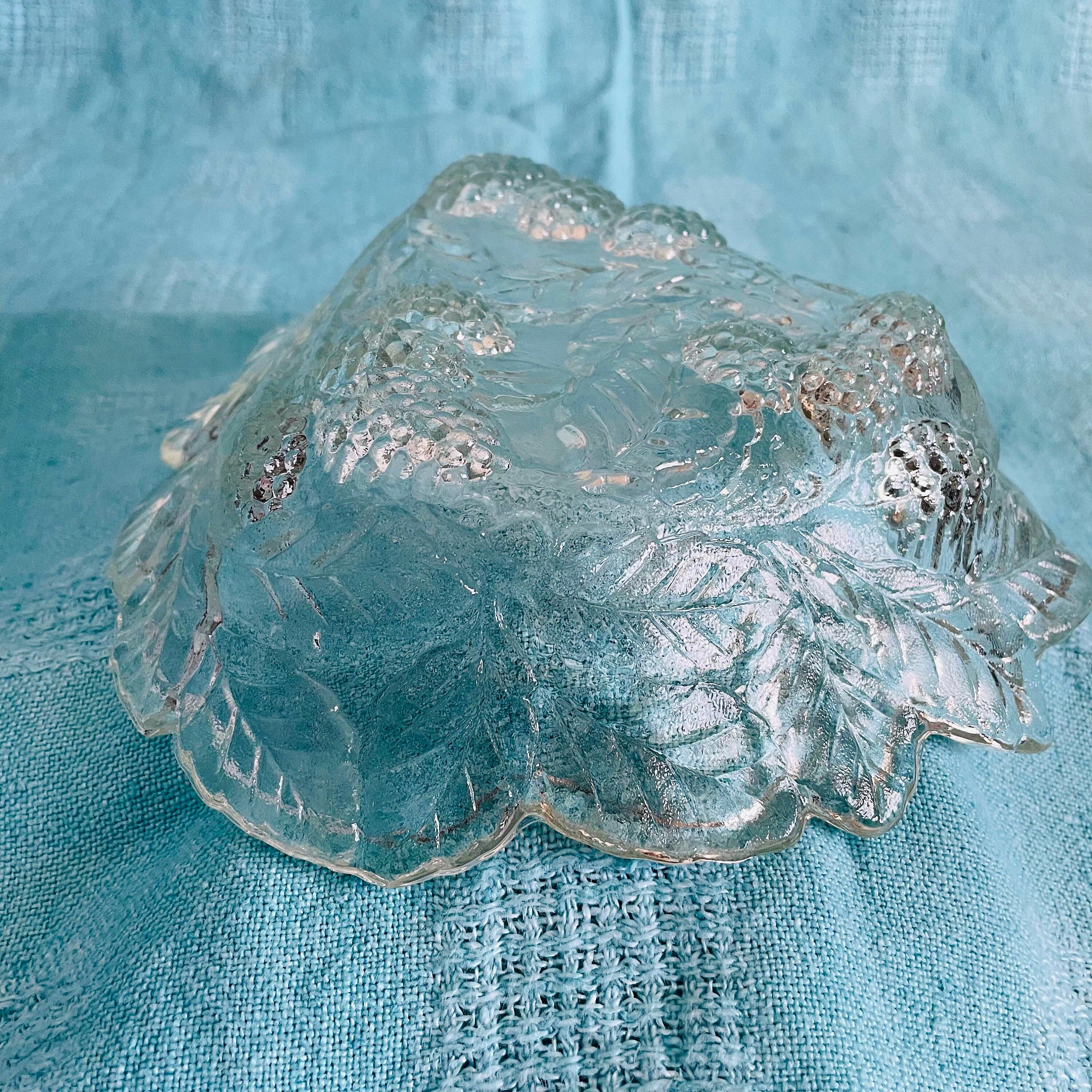 Add a touch of 1920s charm to your table with a truly unique triangular-shaped glass bowl from Indiana Glass, featuring the Loganberry pattern with a beautifully detailed high-relief exterior of berries and leaves in pressed glass. This clear Depression glass bon bon dish was produced between 1920–1930 and reflects the craftsmanship and charm of early American glassware.