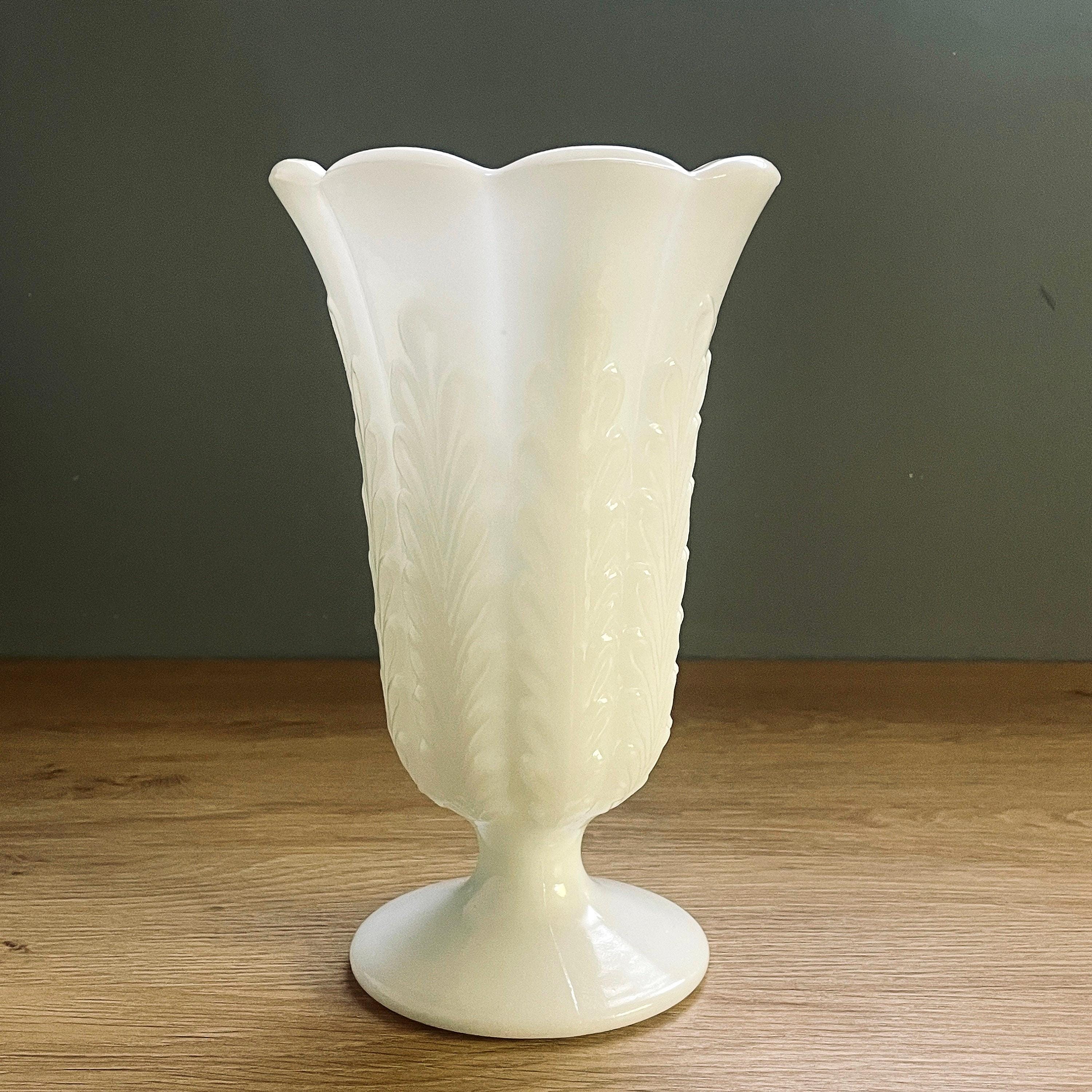 This glossy white milk glass vase by E.O. Brody has a fluted shape with panelled and raised leaf design, a scalloped edge around the top and a footed pedestal base. The vase is embellished with a beautiful textured fern / leaf motif and the bottom is marked: EO BRODY M5200 CLEVELAND OHIO USA. An understatedly elegant vase to make floral or greenery arrangements which is lovely enough to serve as a decorative home accent on its own. Measures is 9 1/4 inches in height by 5 1/2 inches in diameter.