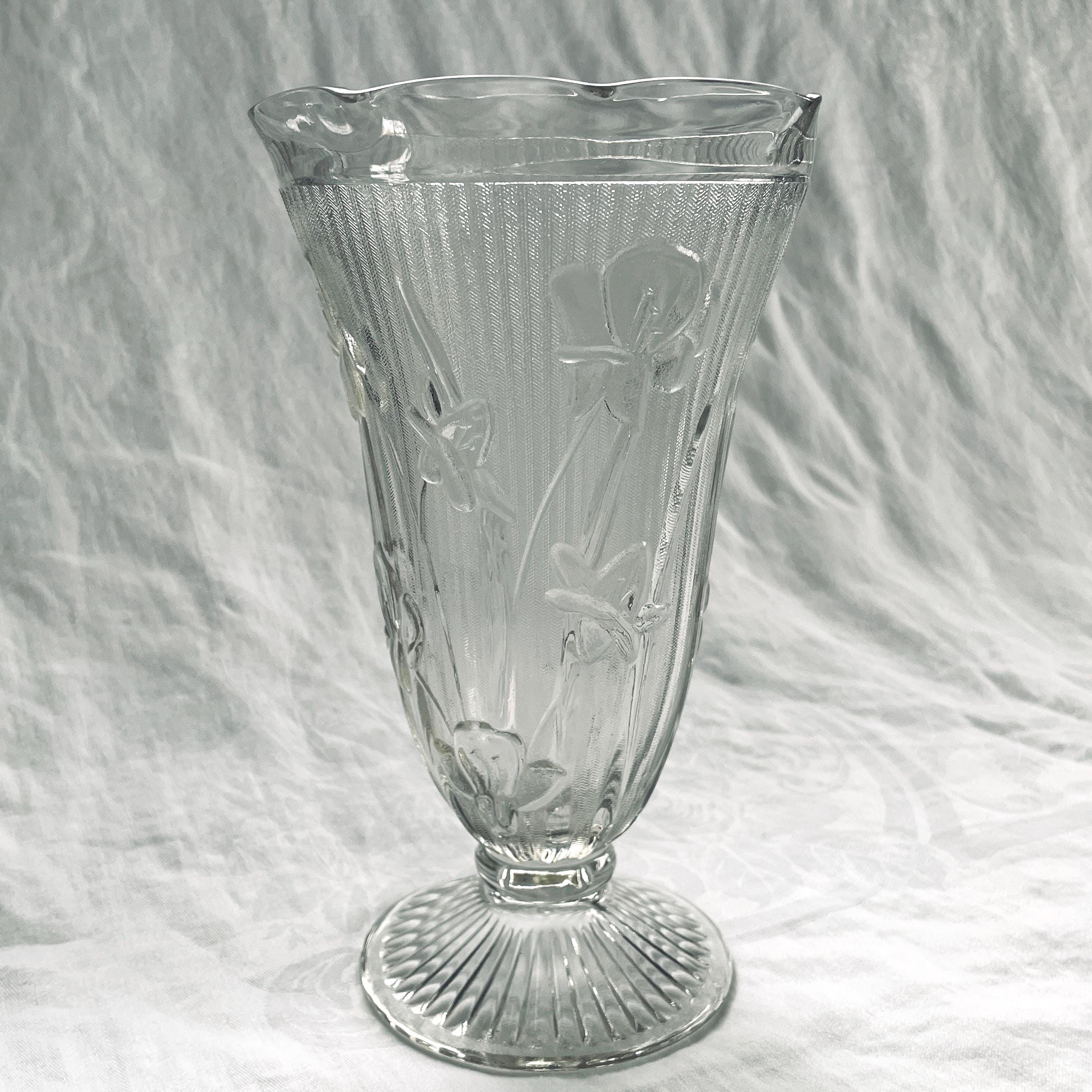Immerse your living space in the elegance of the 1920s with this exquisite Vintage Floral Pattern Footed Vase from Jeannette Glass, a masterful creation that captures the refined aesthetic of depression glass. Standing gracefully at 9 inches, this clear flower vase offers more than just a place for your favorite blooms; it's a statement piece that echoes the charm of a bygone era. The meticulously crafted iris and herringbone pattern showcases the Jeannette Glass Company's signature artistry, adding a touch of antique sophistication to any room. Imagine sunlit irises shimmering through the vase's clear glass, a nostalgic reminder of 1920s glass decor at its finest. Whether as a centerpiece on your dining table or an accent on your mantel, this vintage beauty promises to enchant with its timeless allure and elegant presence. This stunning vase measures 9 inches in height by 5 inches in width.