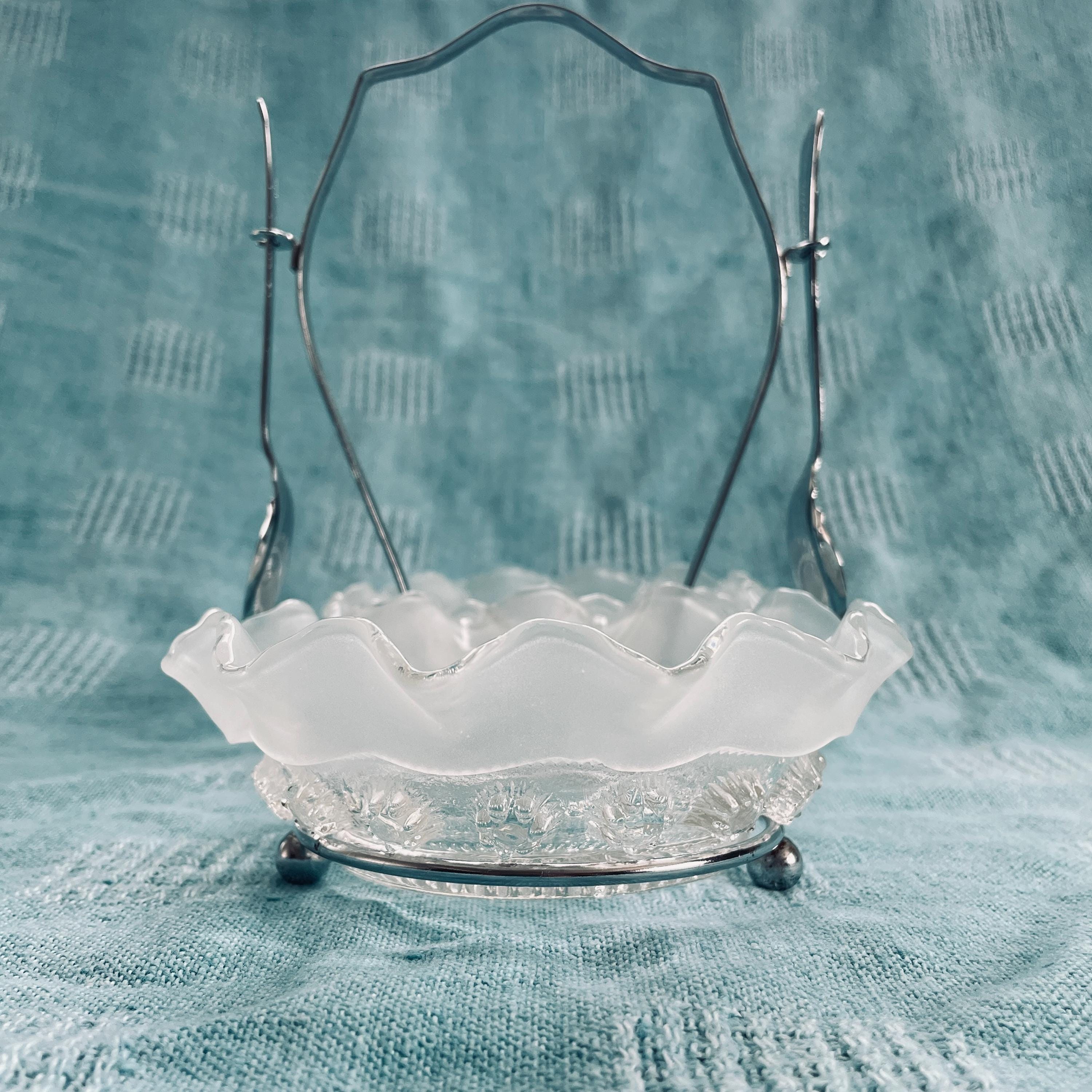 Enhance your dining table with a touch of Art Deco elegance! This chrome-plated double-dish condiment stand features two exquisite Blackberry Prunt #269 design bowls by George Davidson. The frosted glass bowls showcase a ruffled edge and a captivating starburst pattern at the center, accented by a charming berry motif around the perimeter, giving the set its lovely name.