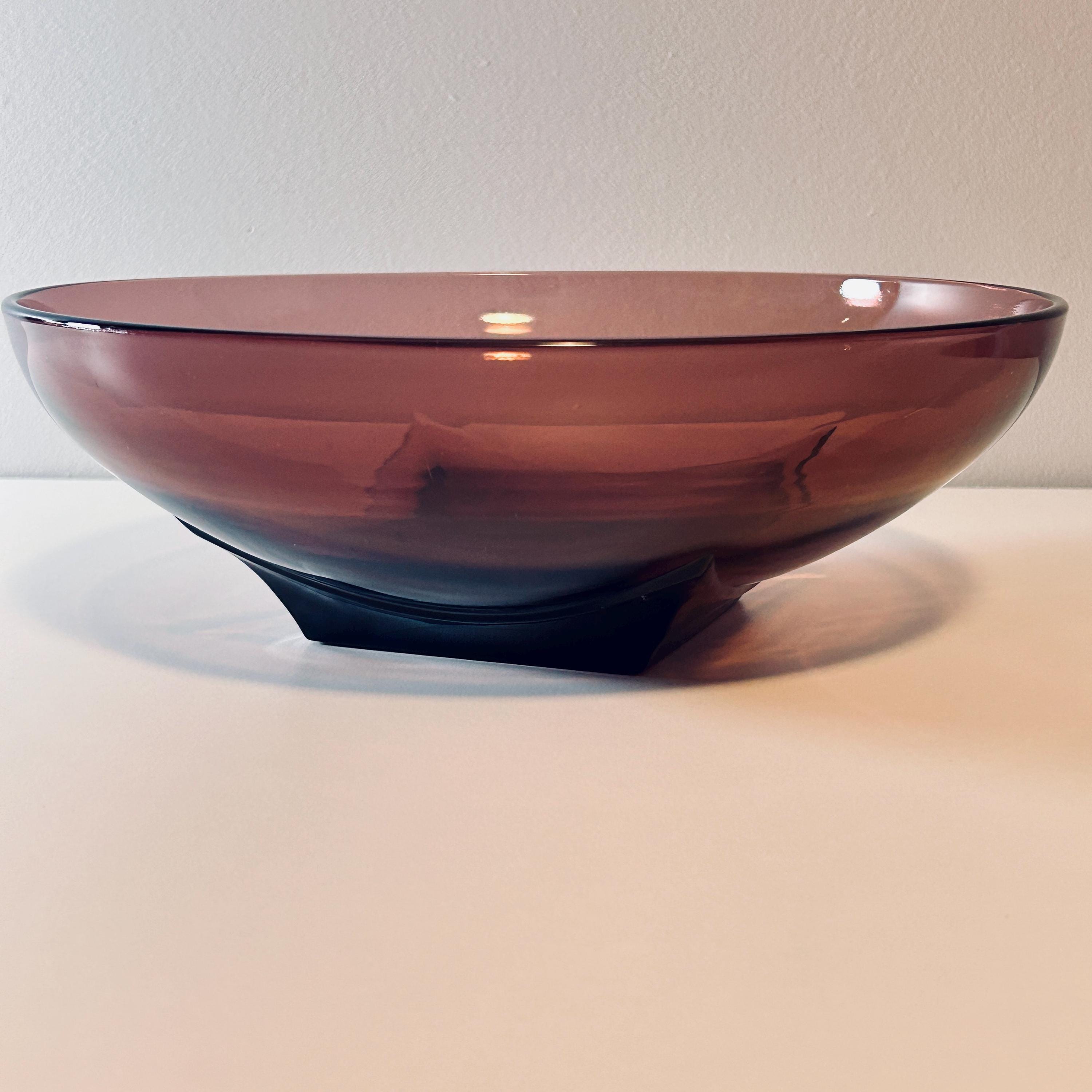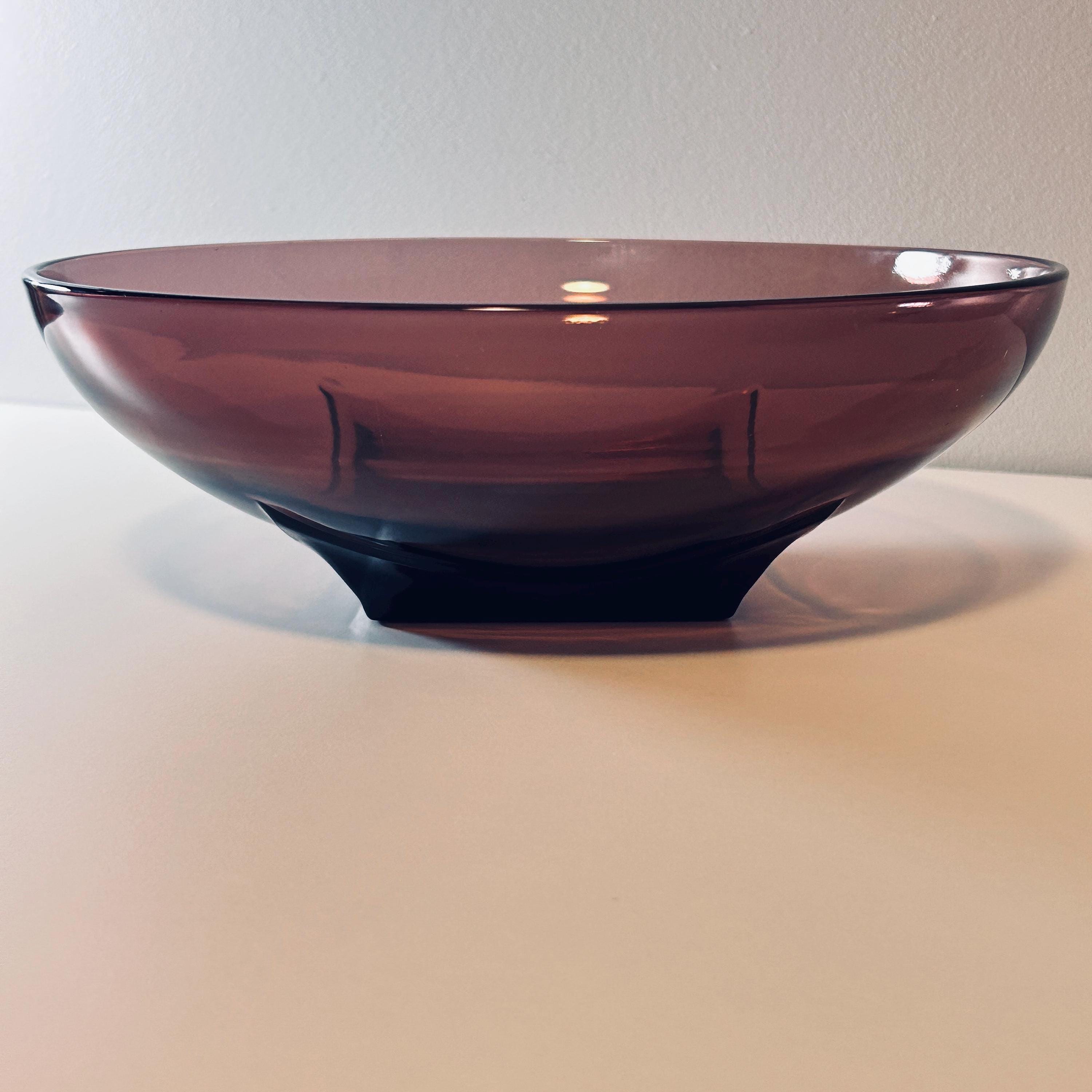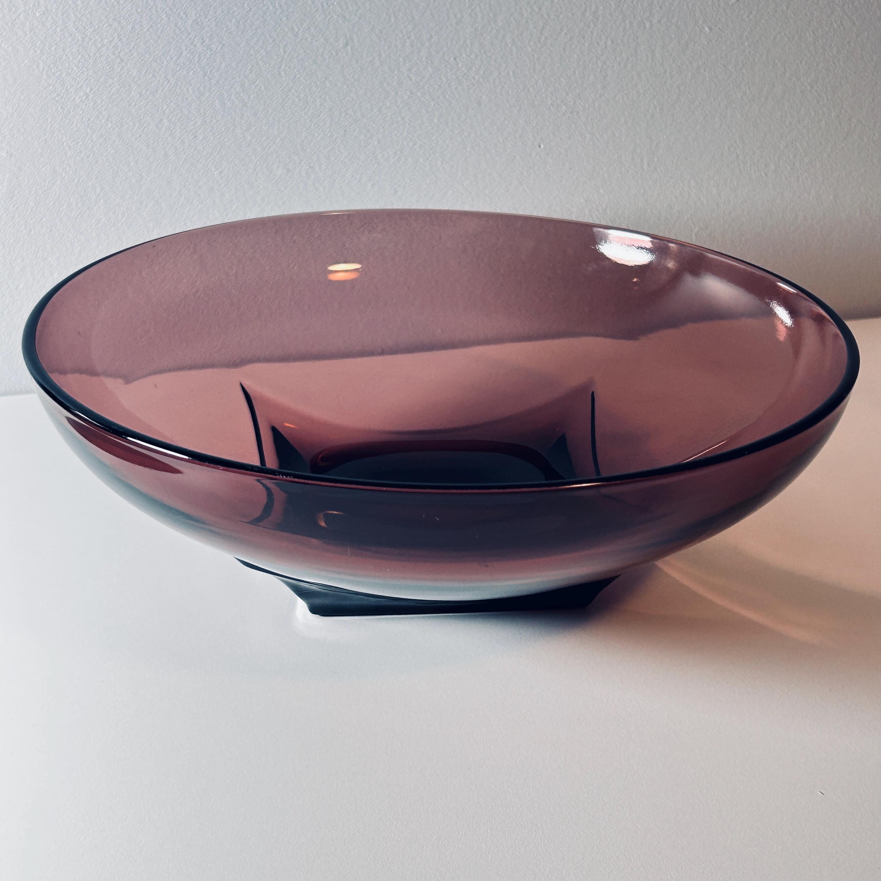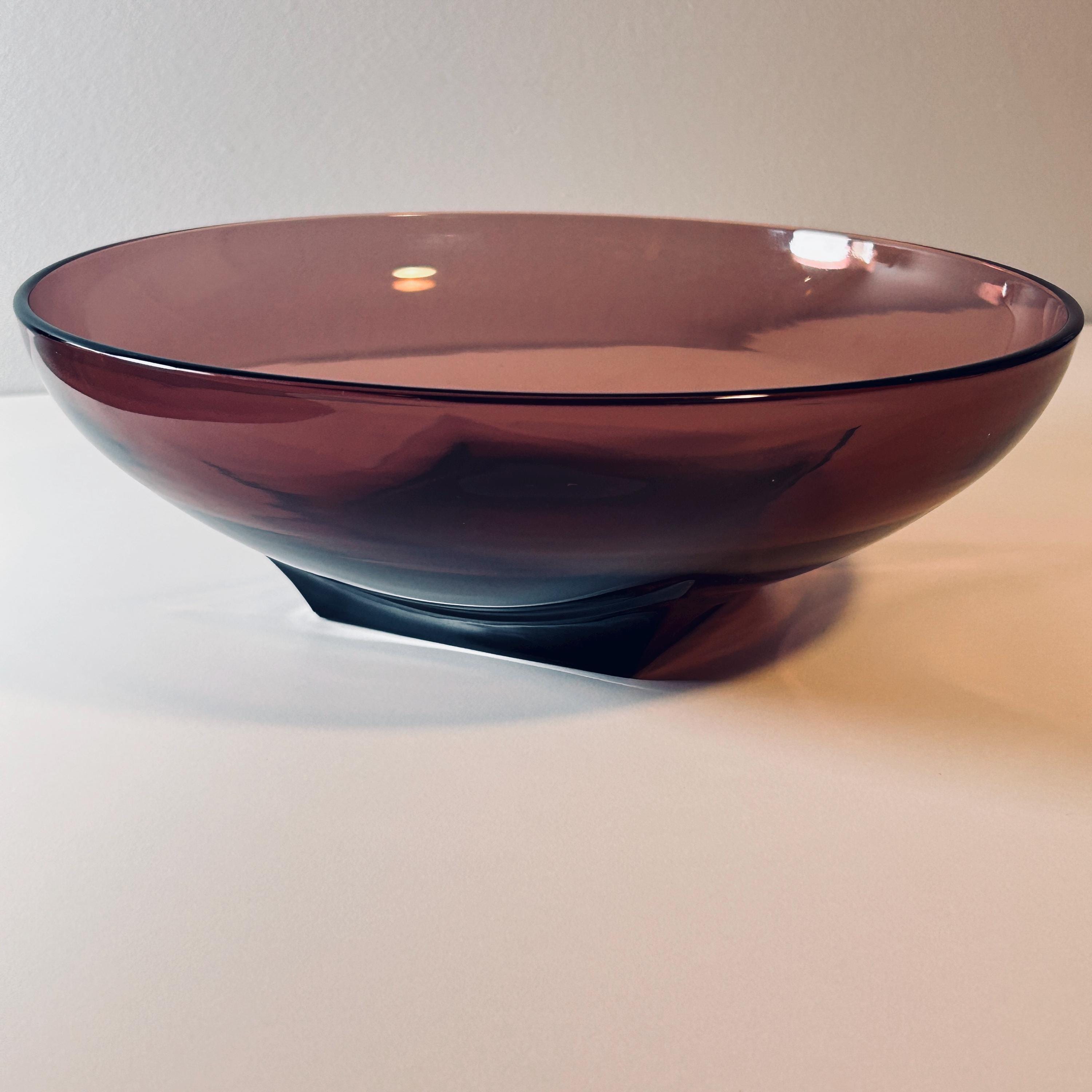 When styled in natural light, the glass reveals a deep, wine-toned translucency—equally striking as a functional serving piece or displayed as a standalone object. Larger examples like this 11" form are especially impactful, offering both scale and visual weight.