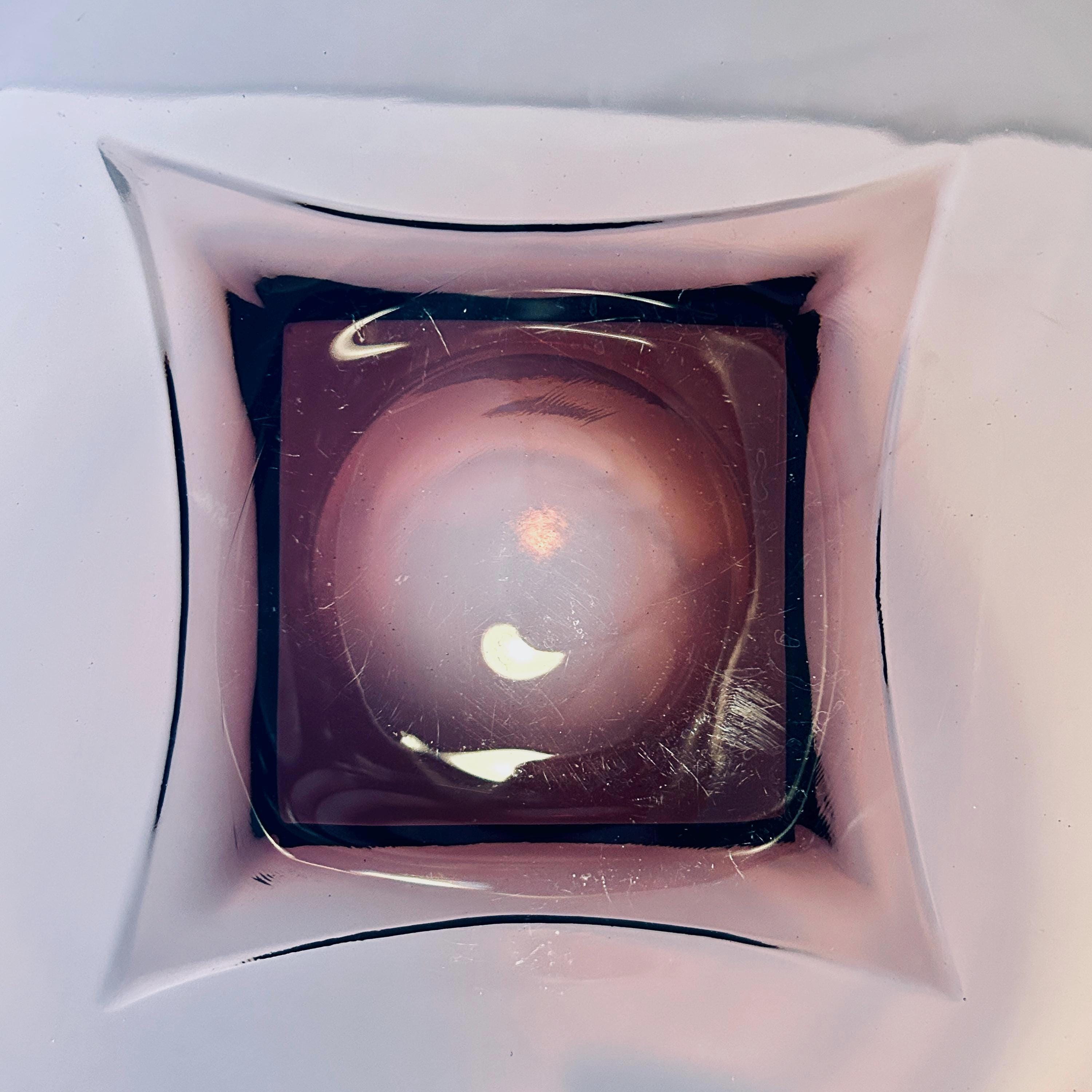 The bowl presents beautifully overall, with a clear, even amethyst tone and no chips or cracks observed. Inside the bowl, there are visible utensil marks in the form of fine surface scratching consistent with prior use. These have been intentionally photographed under direct lighting to appear more pronounced, ensuring full transparency.
