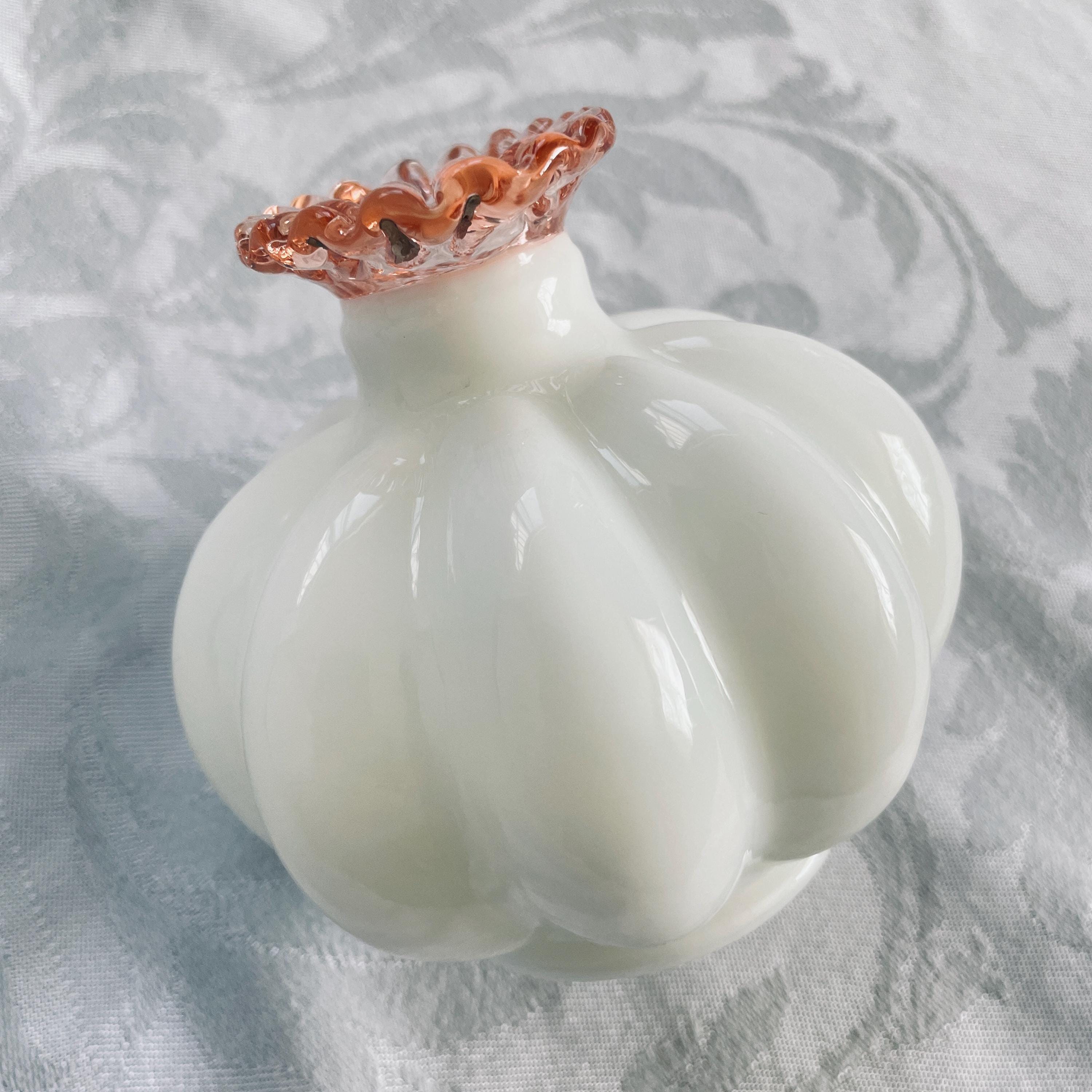Experience timeless elegance with the Fenton Rose Crest Melon Bud Vase, a masterful piece of Fenton Art Glass that beautifully combines artistry and functionality. This vintage perfume bottle, with its graceful overlay pattern in glistening white milk glass, exudes an air of sophistication that transcends time. Just like a symphony of design, each curve and contour offers a visual delight reminiscent of the delicate folds of a rose. The vase's soft pink crest adds a charming pop of color, evoking a gentle whisper of nature's beauty. Perfect for adding a touch of nostalgic charm to your vanity or as a standalone decorative piece, the Fenton Rose Crest Milk Glass Bud Vase invites a serene, vintage allure into any room. It is not only a testament to Fenton's craftsmanship but also a treasured heirloom piece that captures the artful essence of a bygone era. The Rose Crest was only produced from 1944-1948; let this rare and exquisite art glass creation transform your space into a spa-like haven of timeless beauty. This piece measures 3-3/4 inches in height and 3-3/4 inches in diameter.