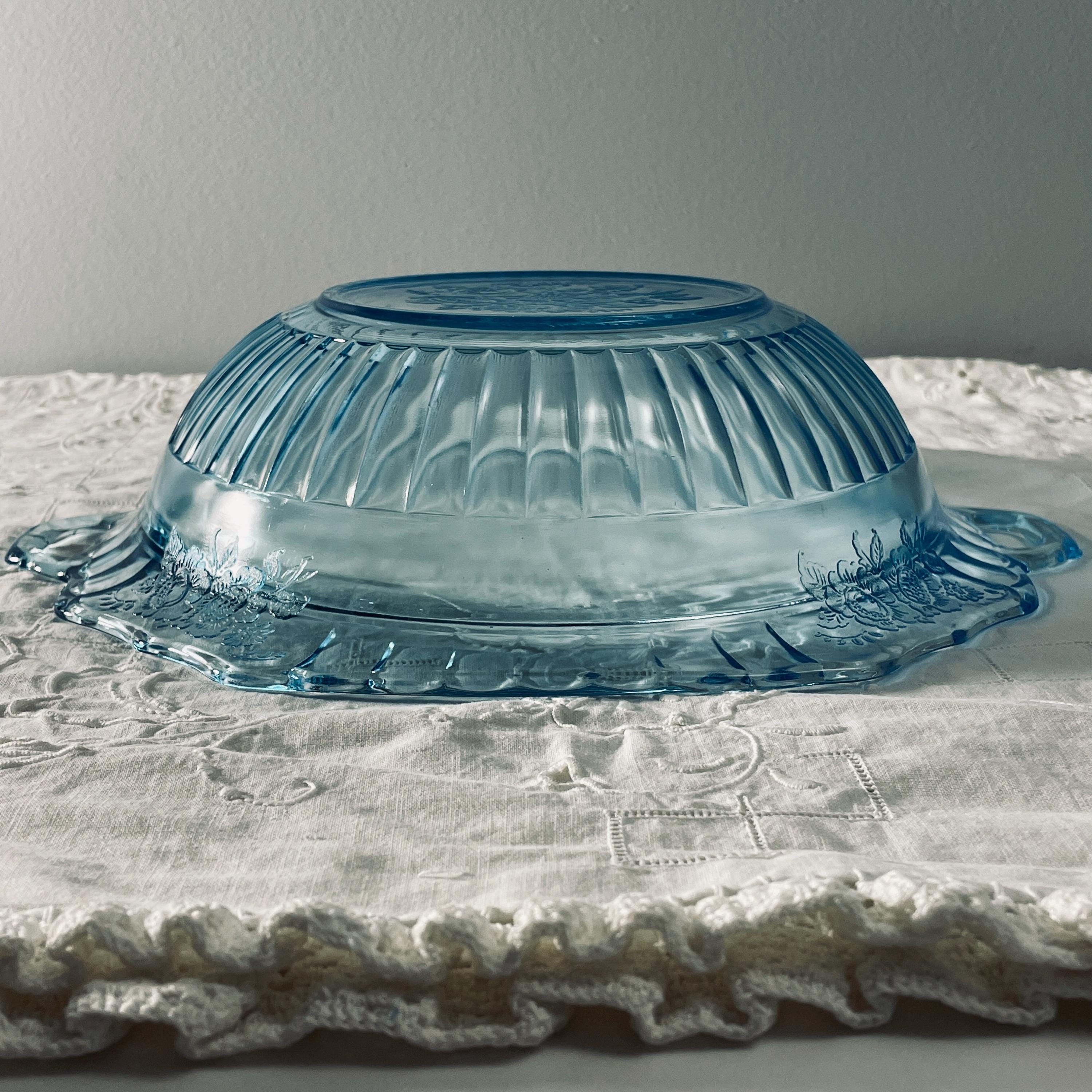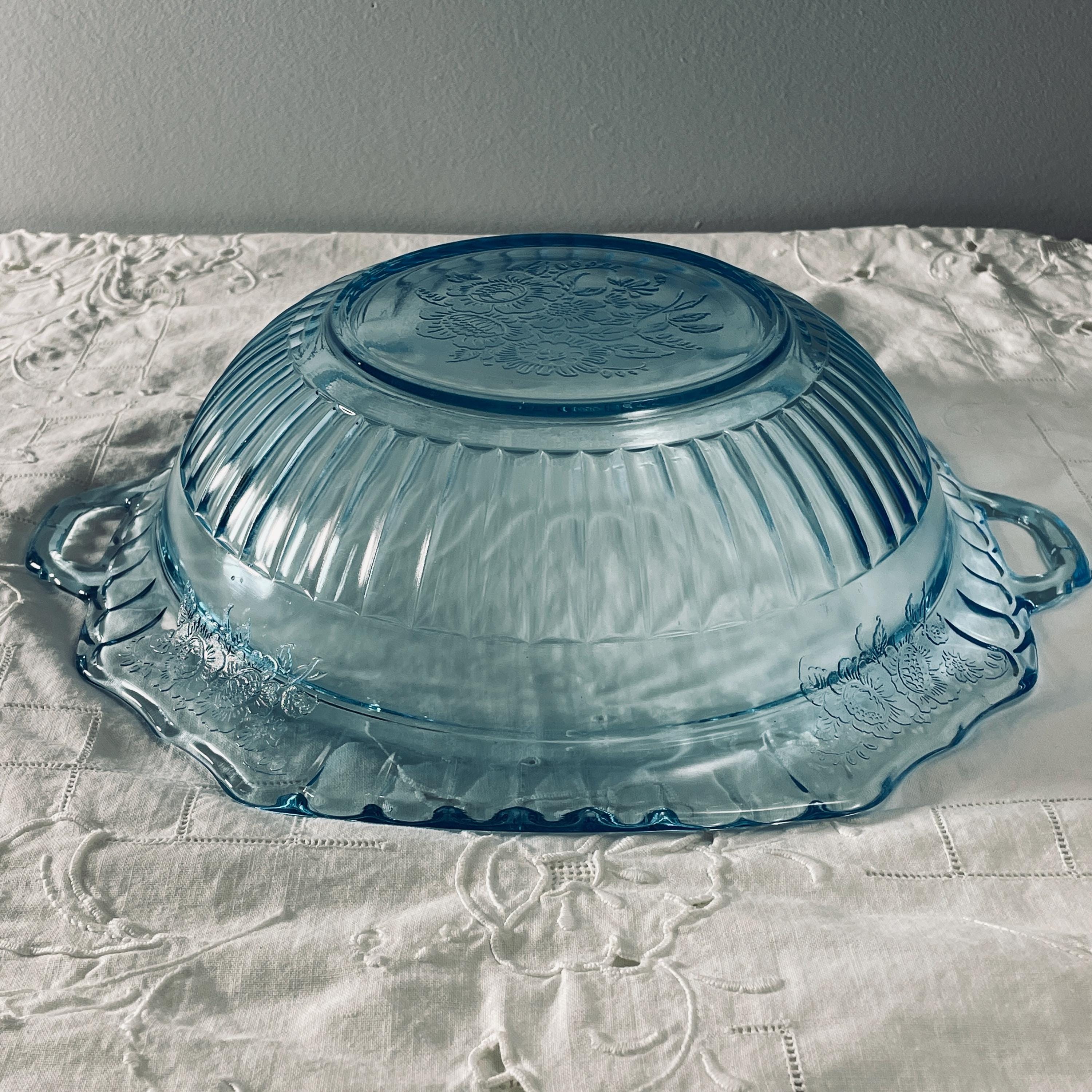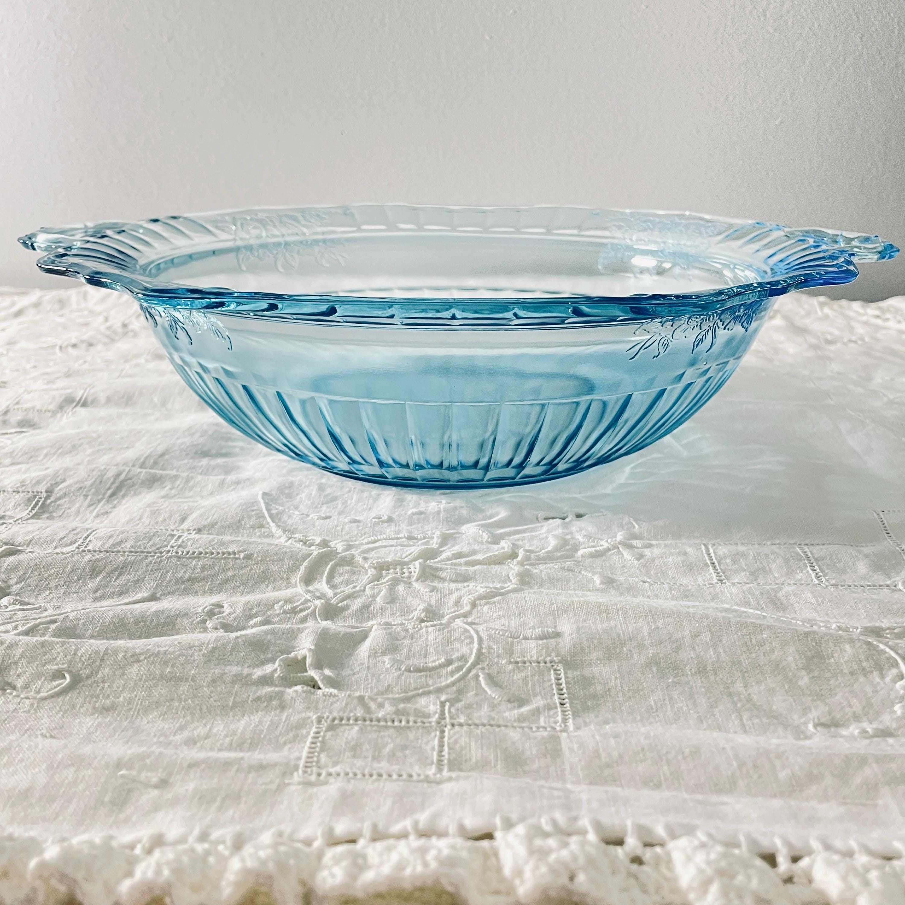 Adorn your table or display with the luminous elegance of this Mayfair Blue handled vegetable bowl by Anchor Hocking, a standout example of authentic American Depression Glass. Produced between 1931 and 1937, this discontinued piece features the beloved Mayfair (Open Rose) pattern, admired for its romantic floral motifs, graceful ribbing, and soft yet vibrant blue hue.
