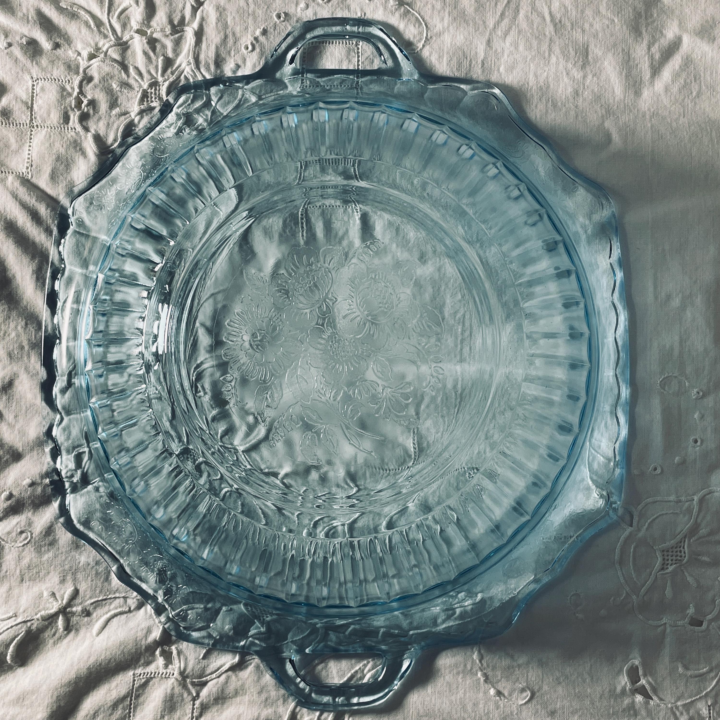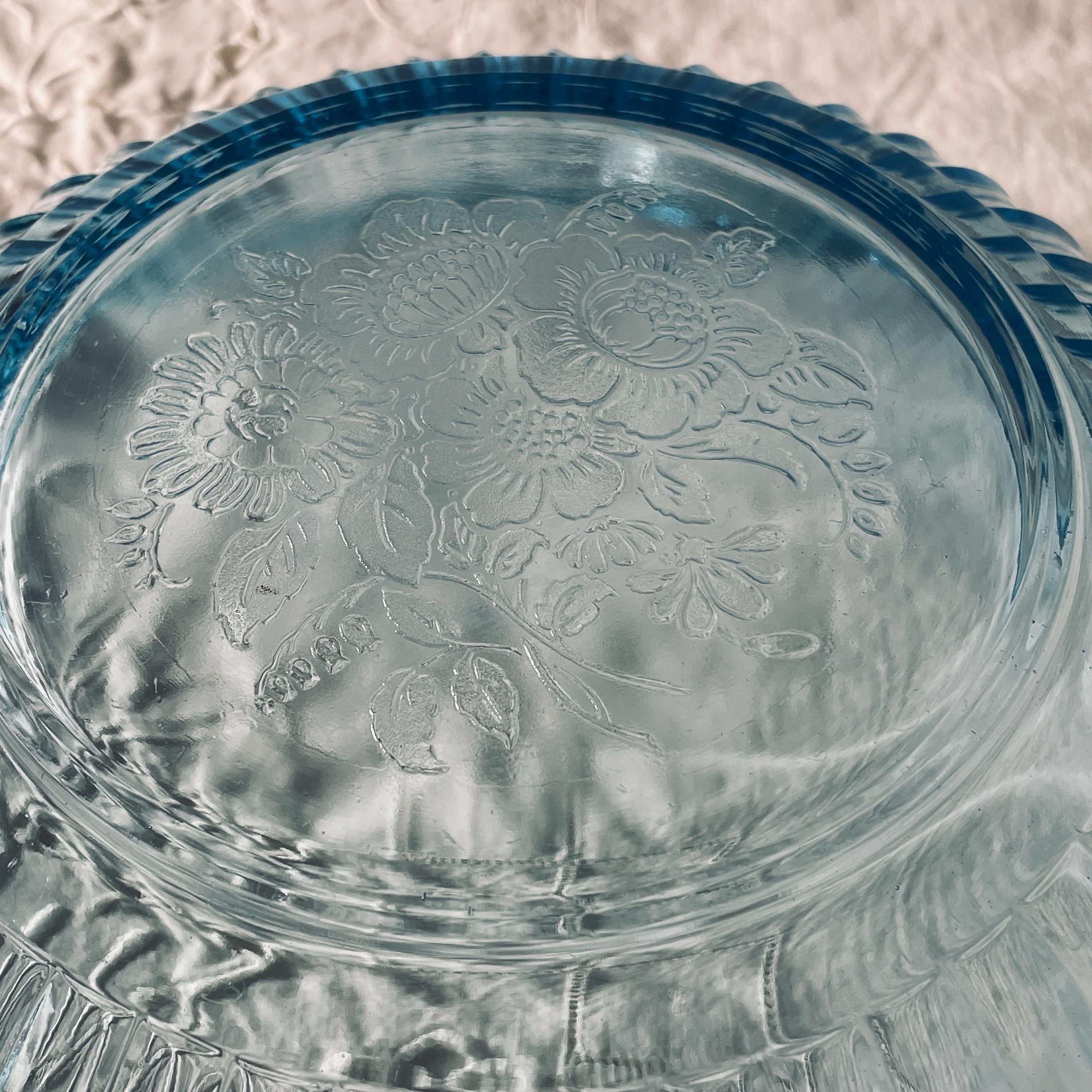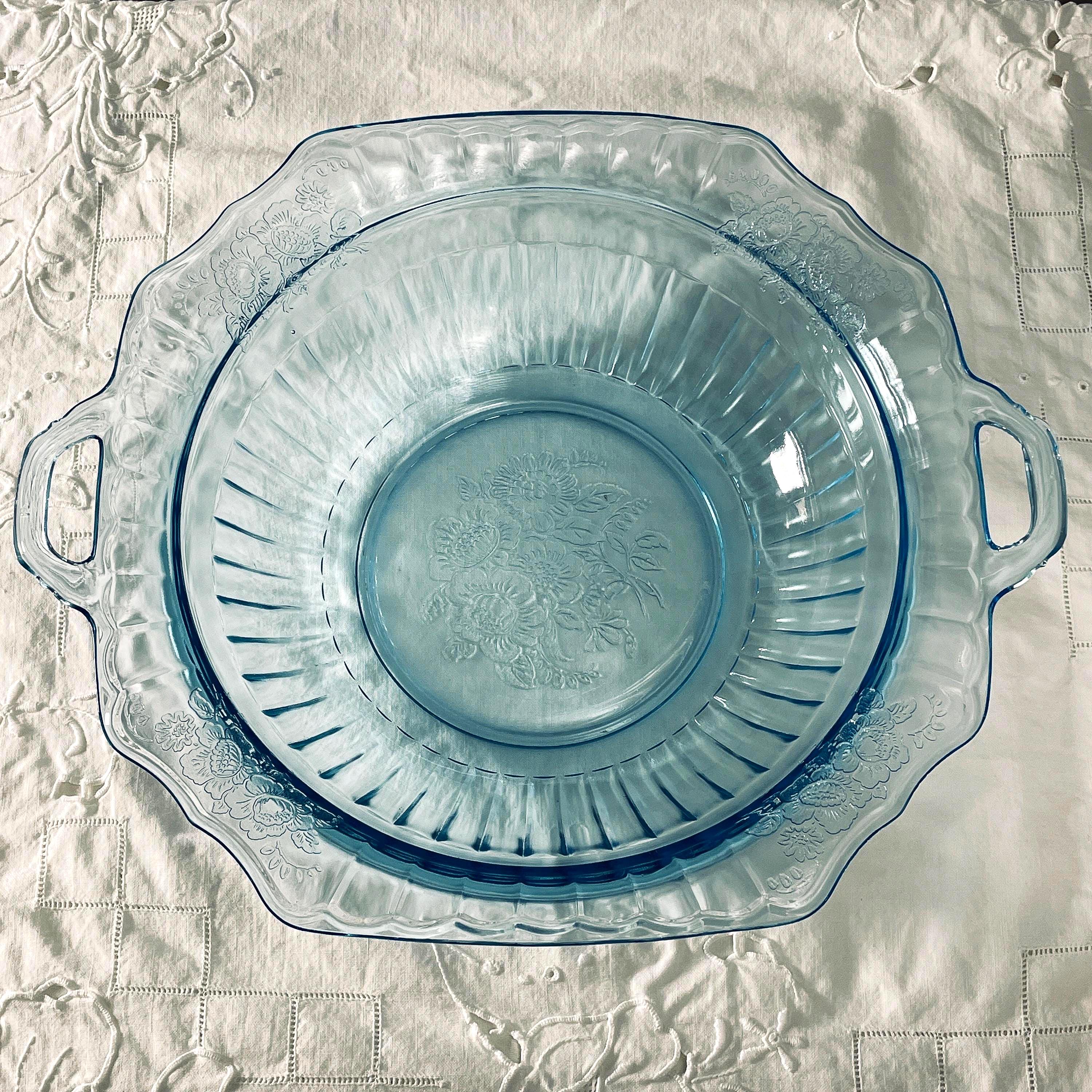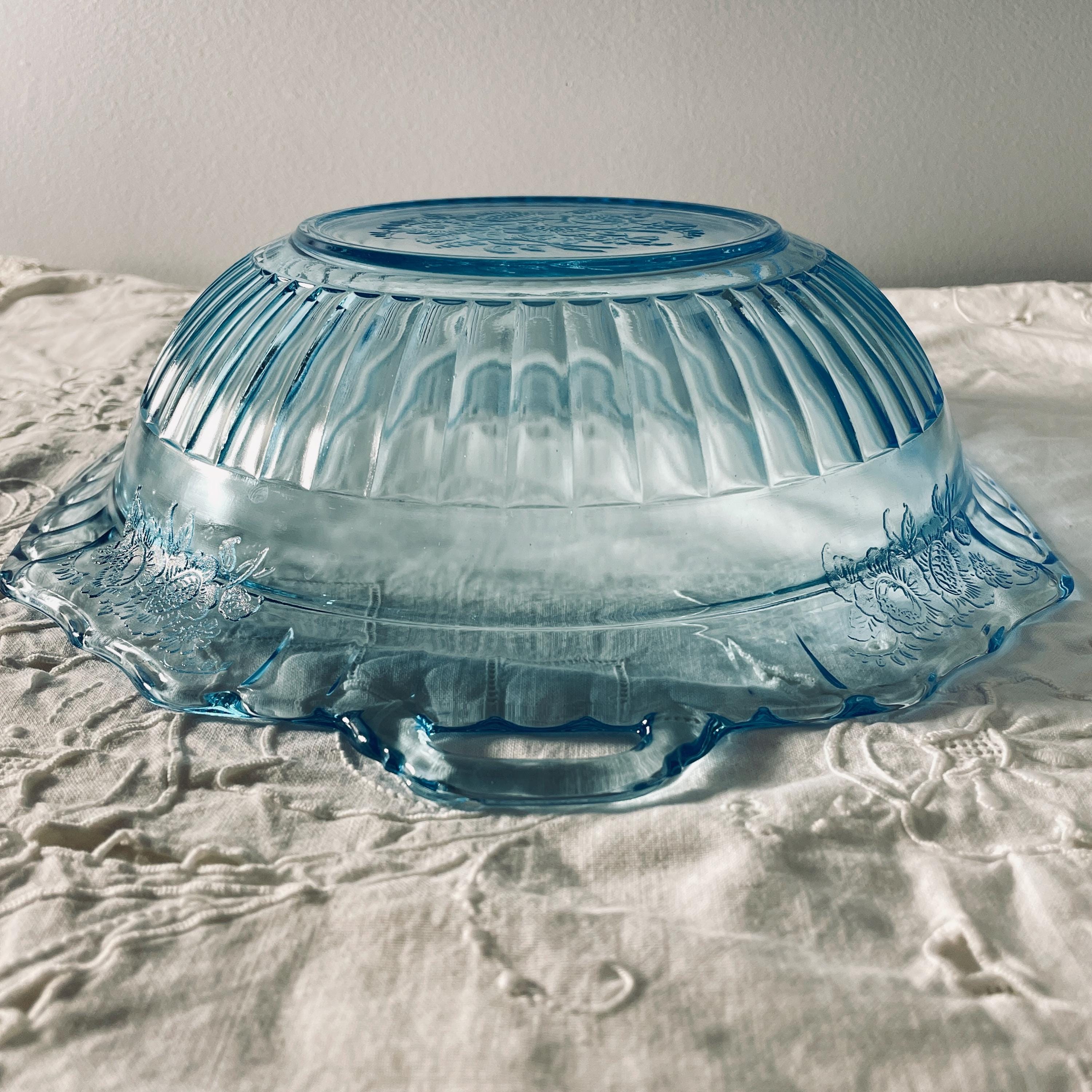 Adorn your table or display with the luminous elegance of this Mayfair Blue handled vegetable bowl by Anchor Hocking, a standout example of authentic American Depression Glass. Produced between 1931 and 1937, this discontinued piece features the beloved Mayfair (Open Rose) pattern, admired for its romantic floral motifs, graceful ribbing, and soft yet vibrant blue hue.