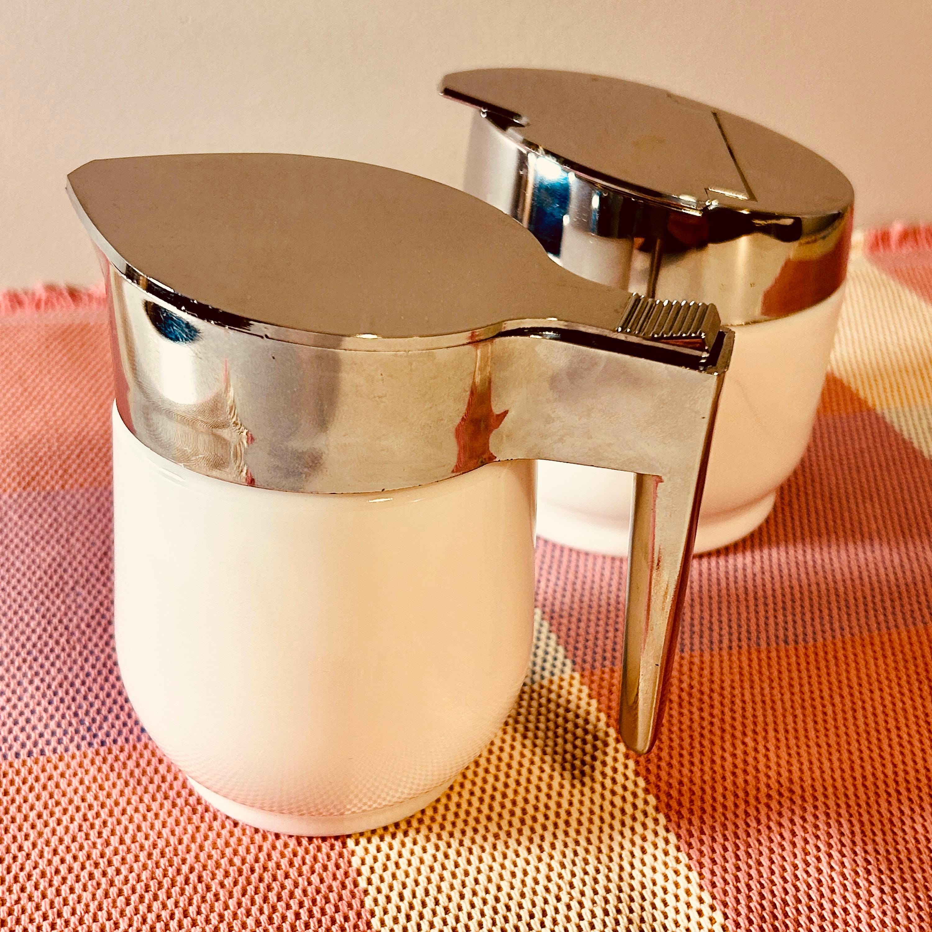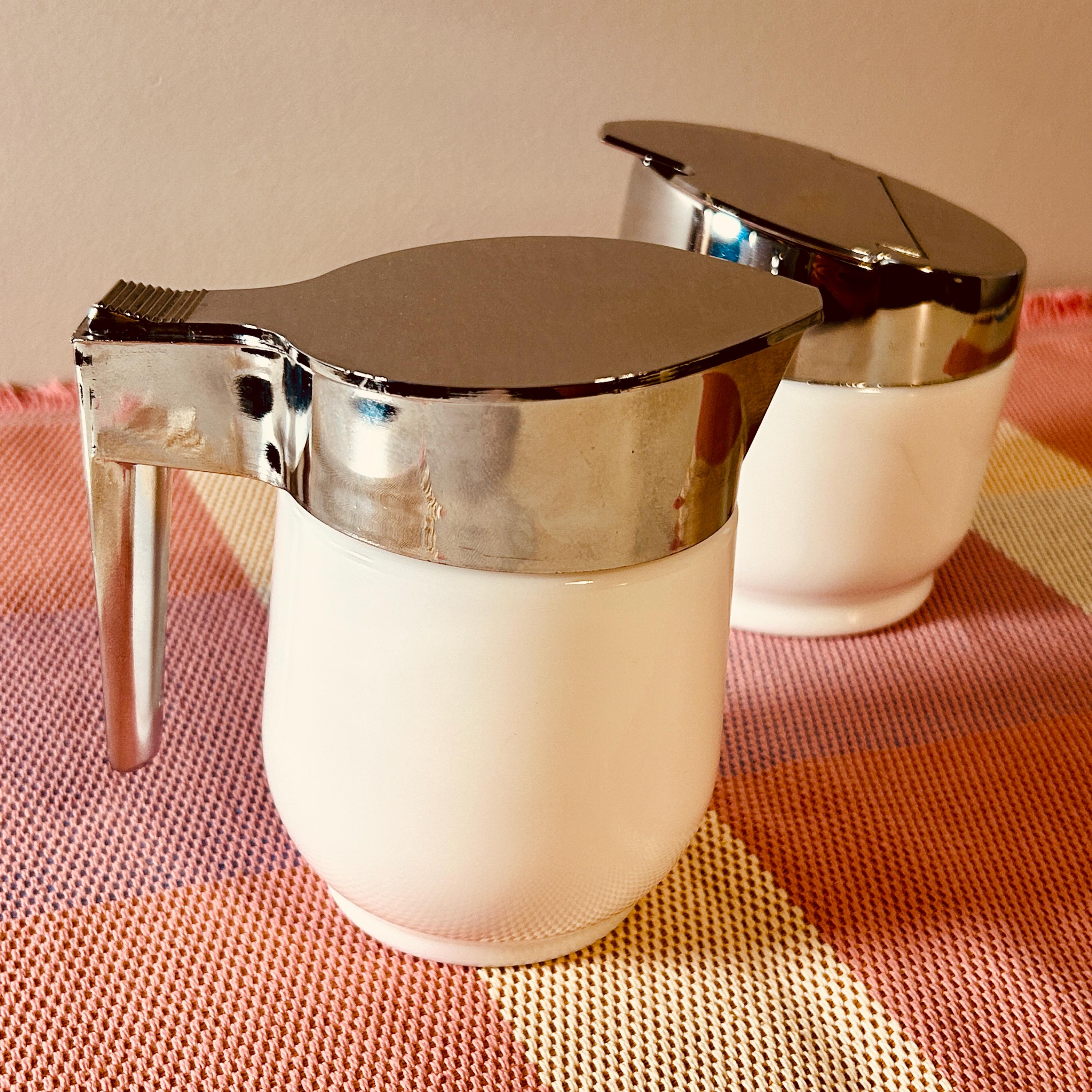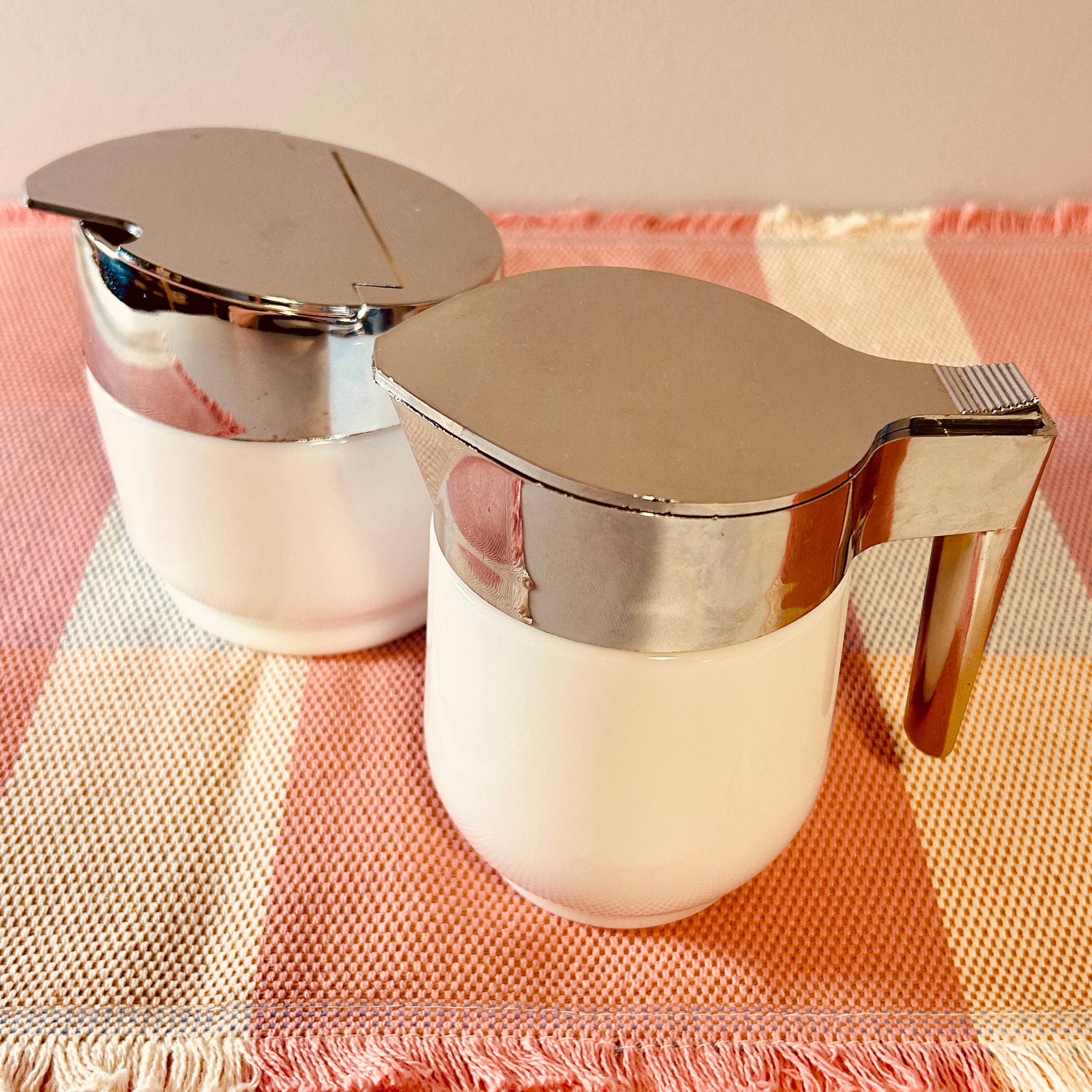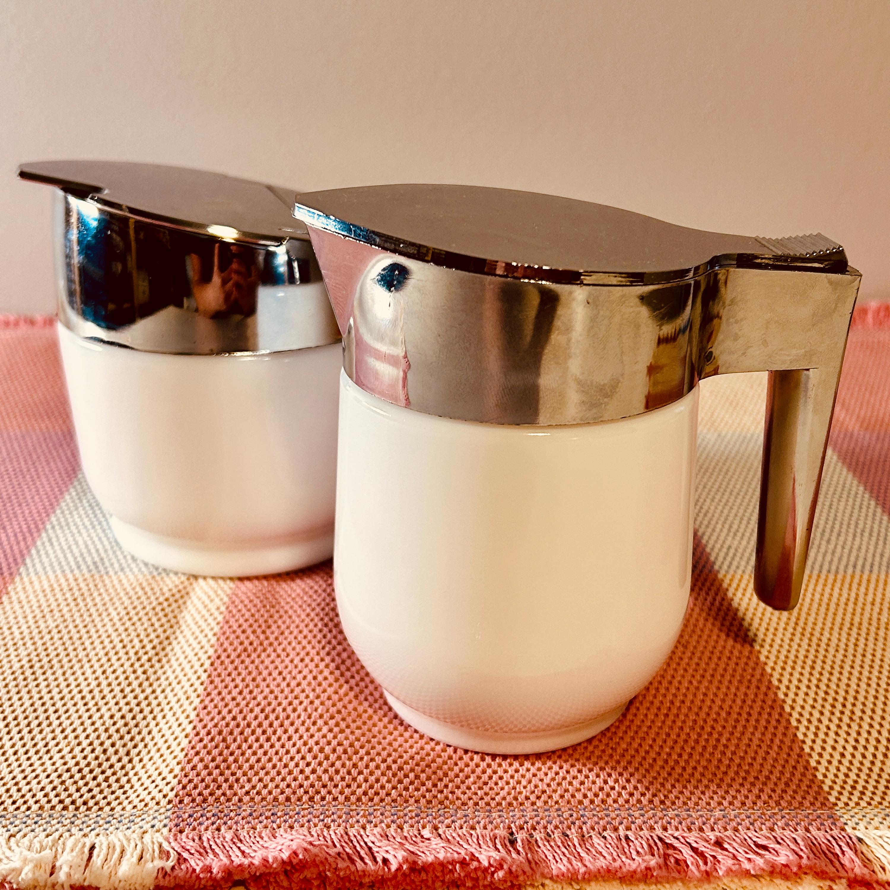 Add a touch of timeless mid-century charm to your kitchen with this vintage creamer and sugar bowl set by Gemco, designed to beautifully complement the iconic Winter Frost White (Corelle) pattern by Corelle. Featuring classic white glass paired with sleek chrome-accented lids and handle details, this charming duo perfectly captures the clean, minimalist aesthetic that made Corelle kitchens a staple of mid-century homes.