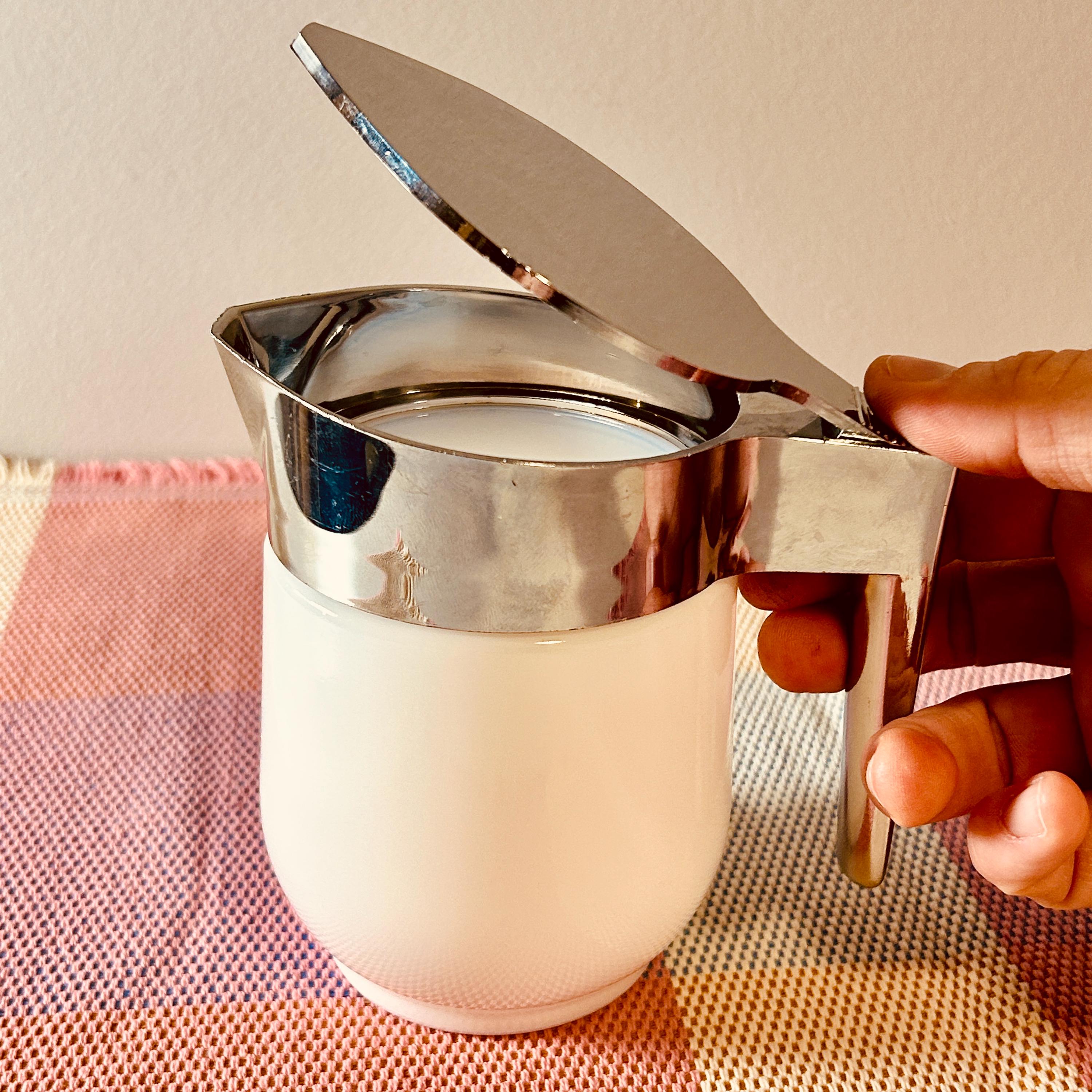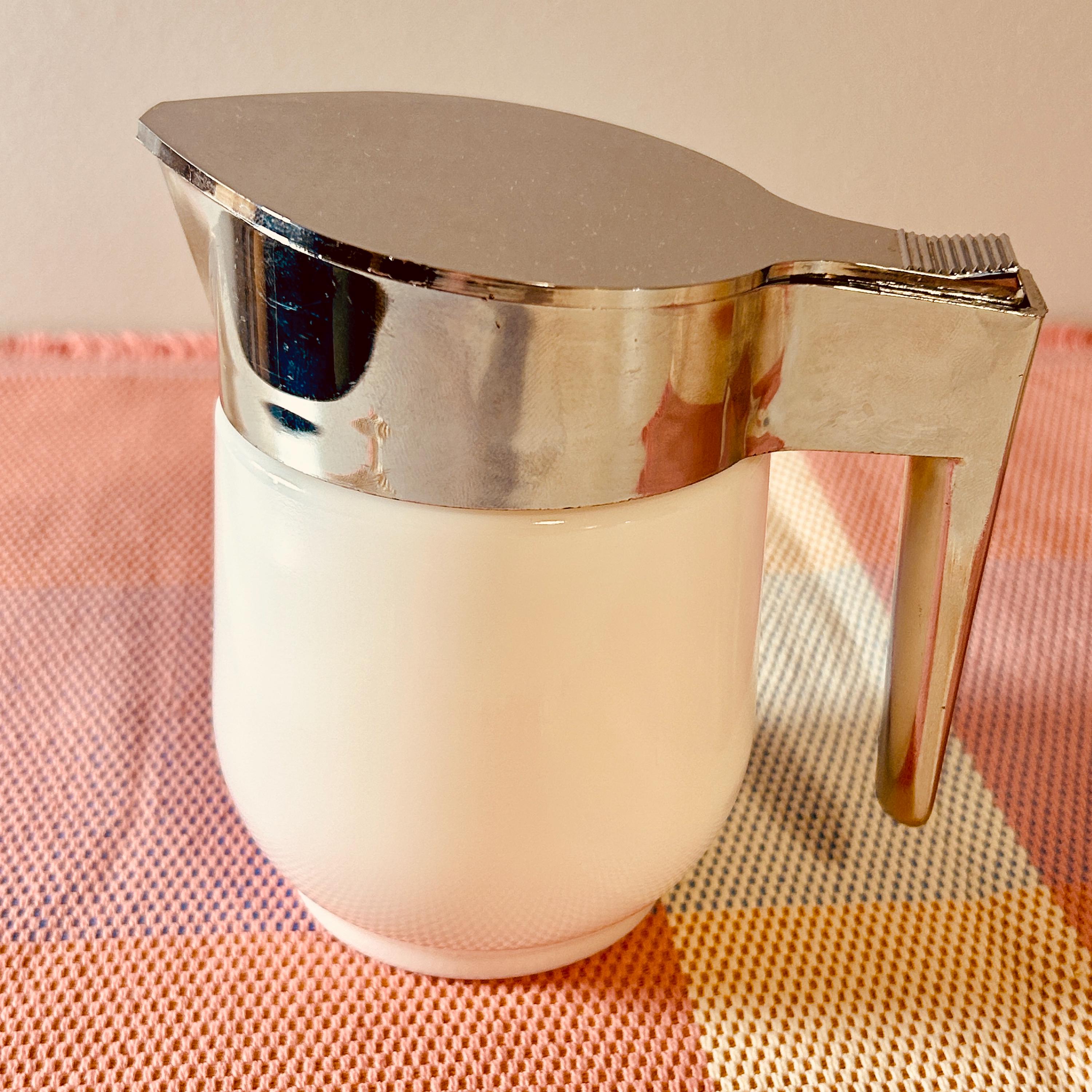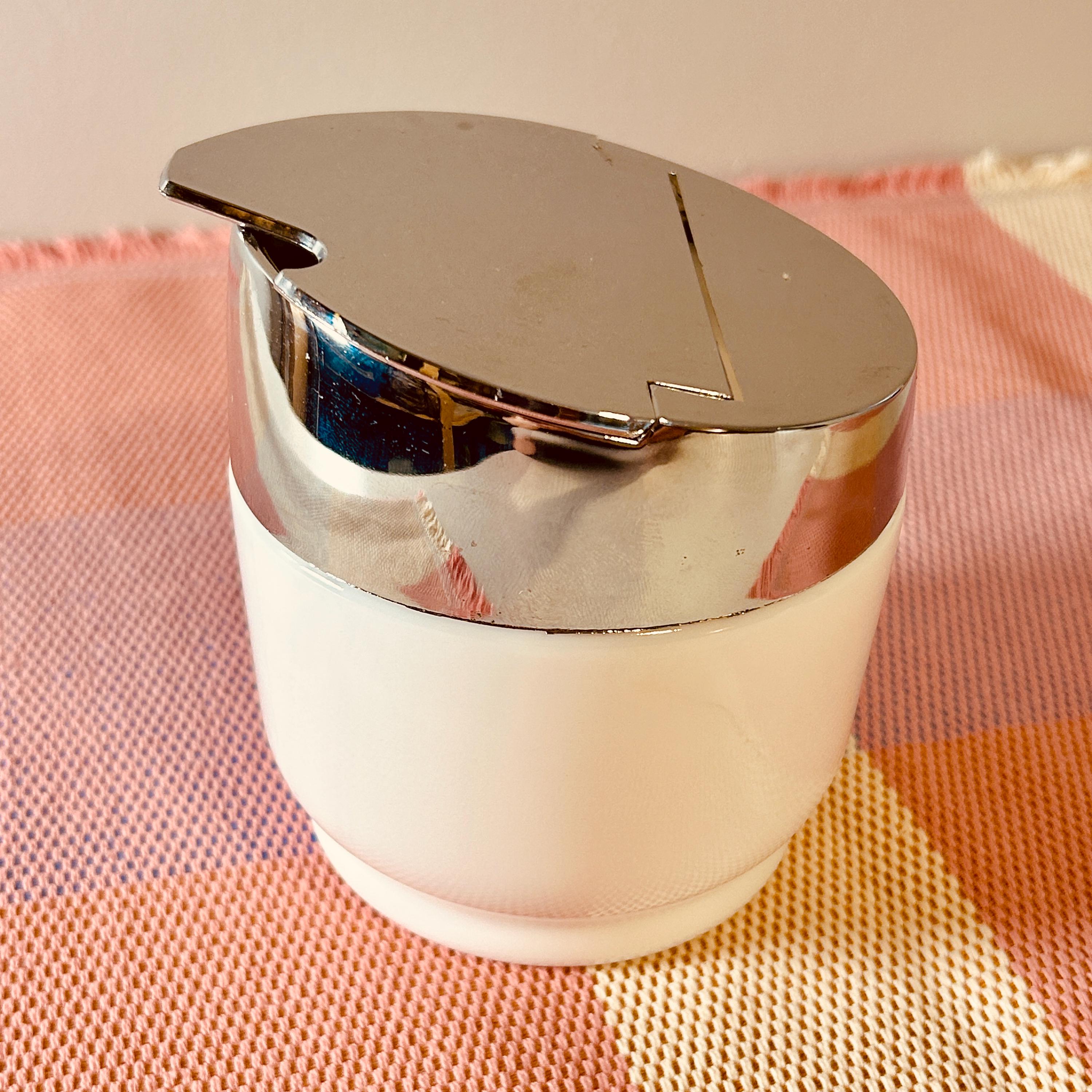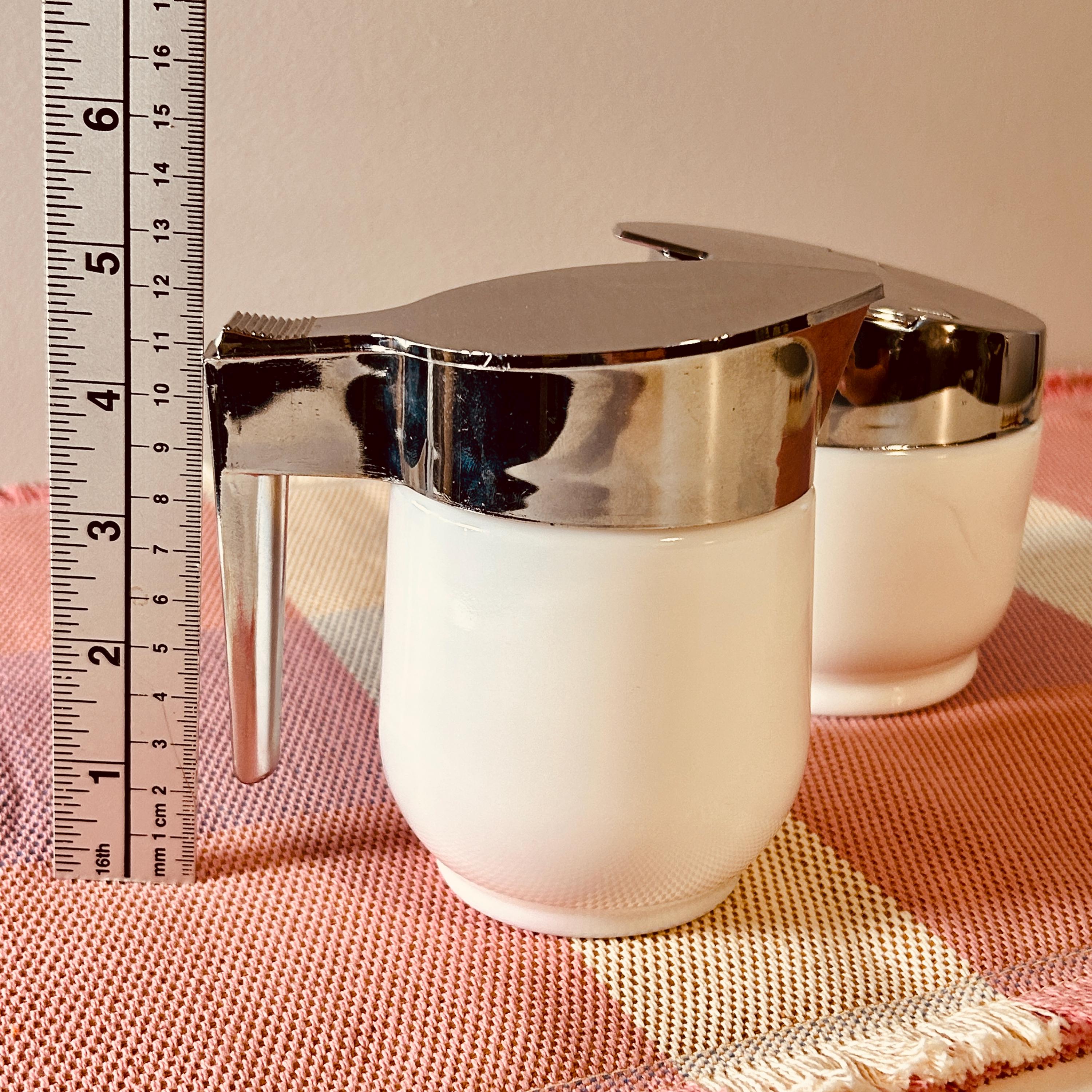 Add a touch of timeless mid-century charm to your kitchen with this vintage creamer and sugar bowl set by Gemco, designed to beautifully complement the iconic Winter Frost White (Corelle) pattern by Corelle. Featuring classic white glass paired with sleek chrome-accented lids and handle details, this charming duo perfectly captures the clean, minimalist aesthetic that made Corelle kitchens a staple of mid-century homes.
