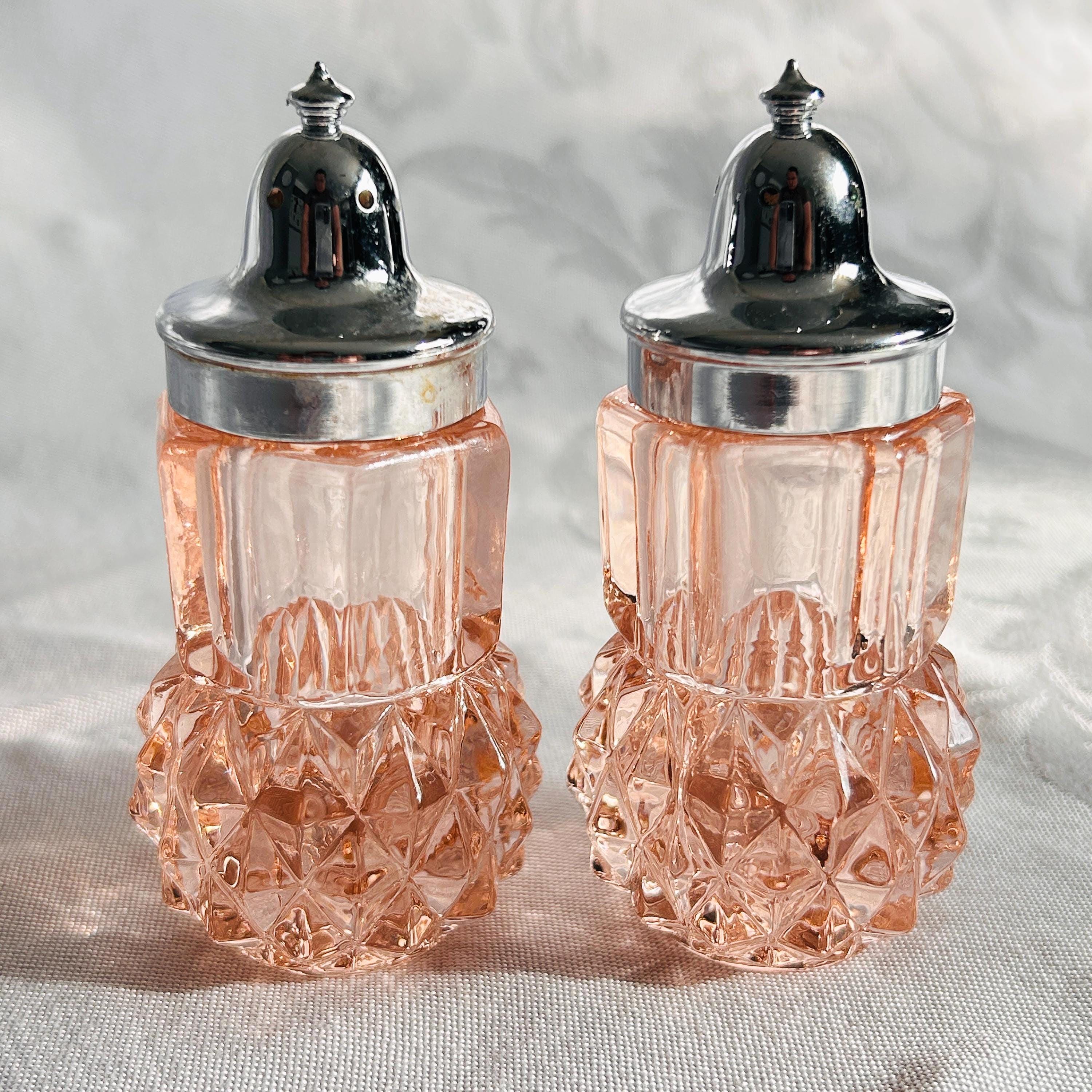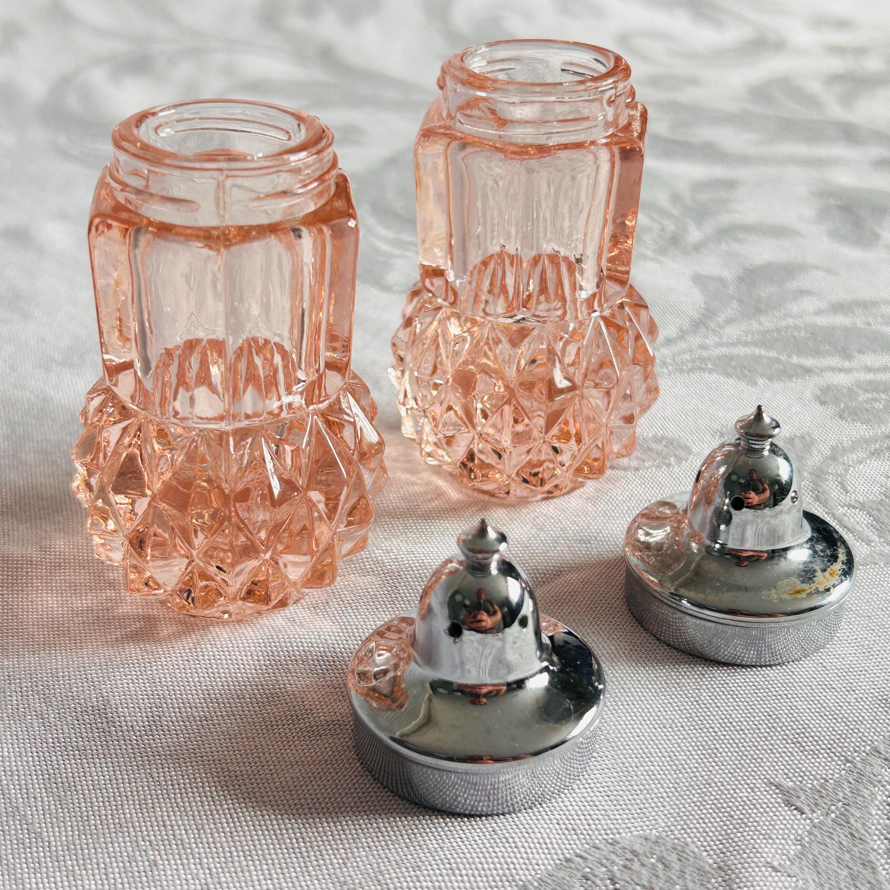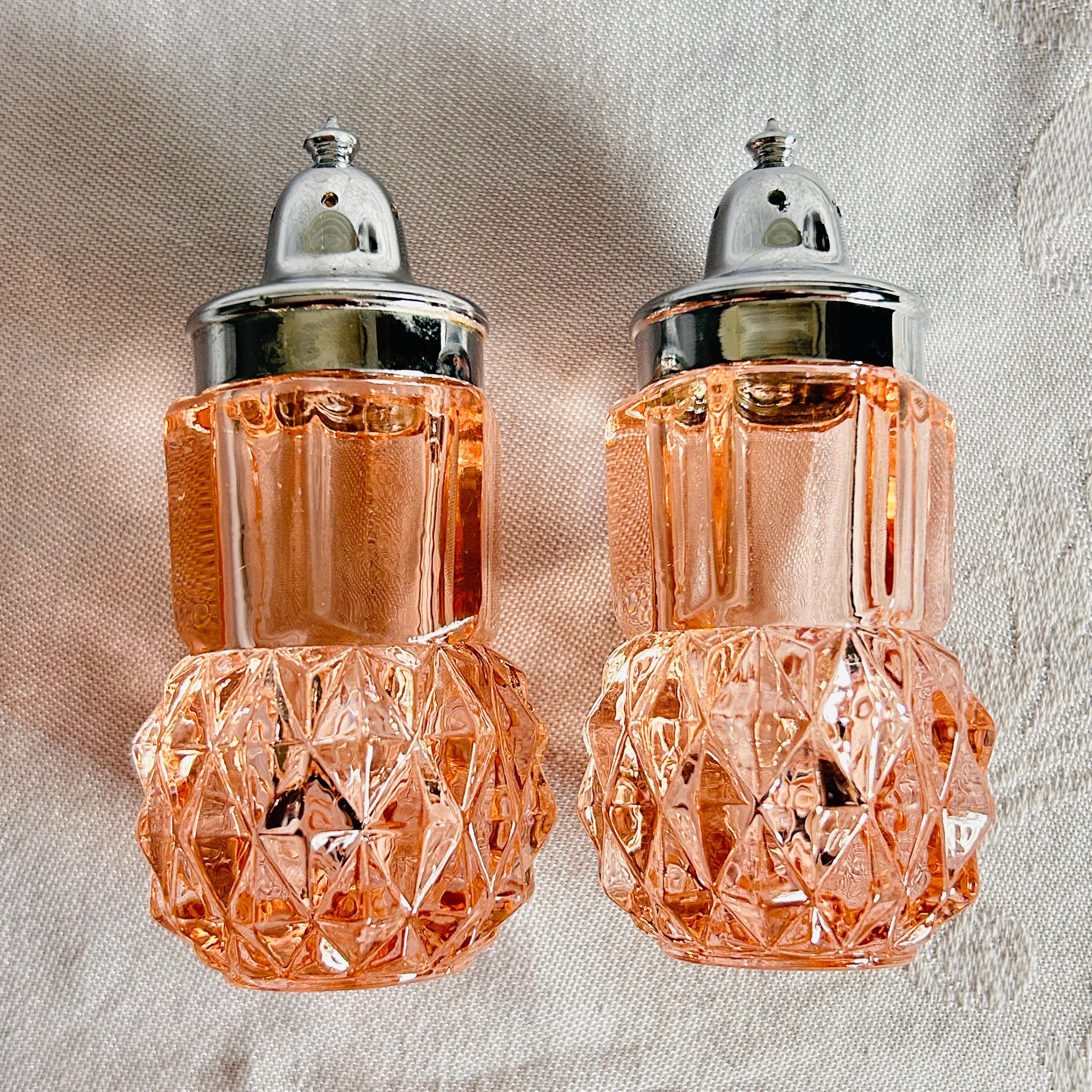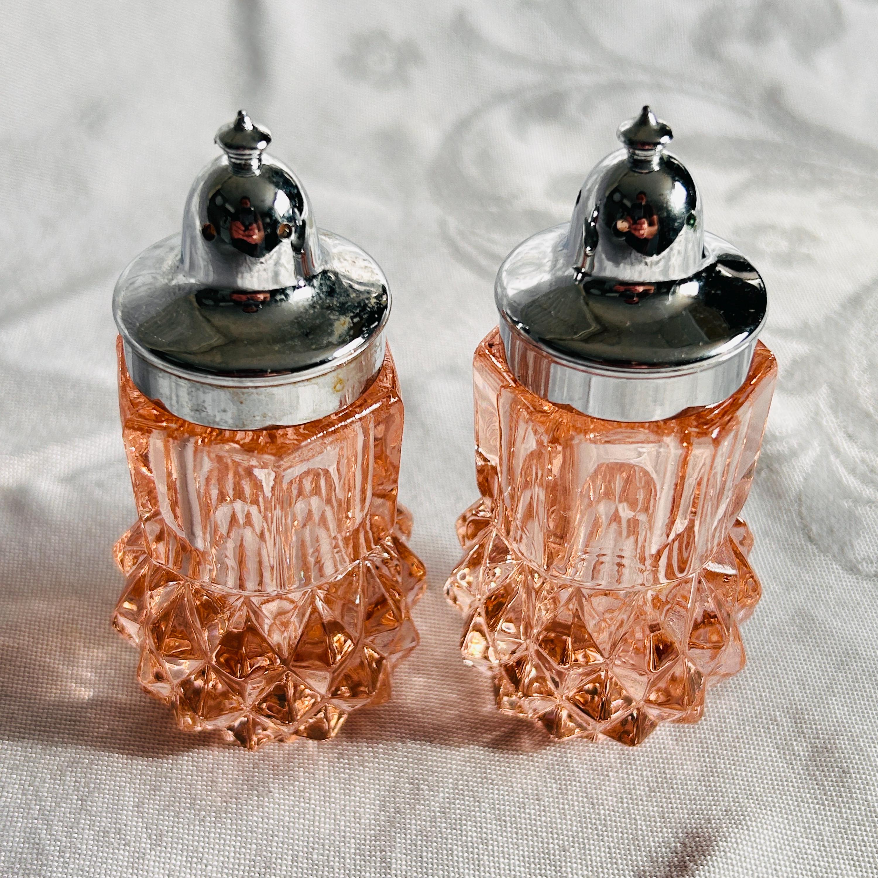 Crafted in the United States, this discontinued pattern features a soft blush-pink hue with a faceted diamond point texture that catches the light beautifully. The shakers are topped with classic chrome-plated lids, adding a timeless contrast to the delicate glass.