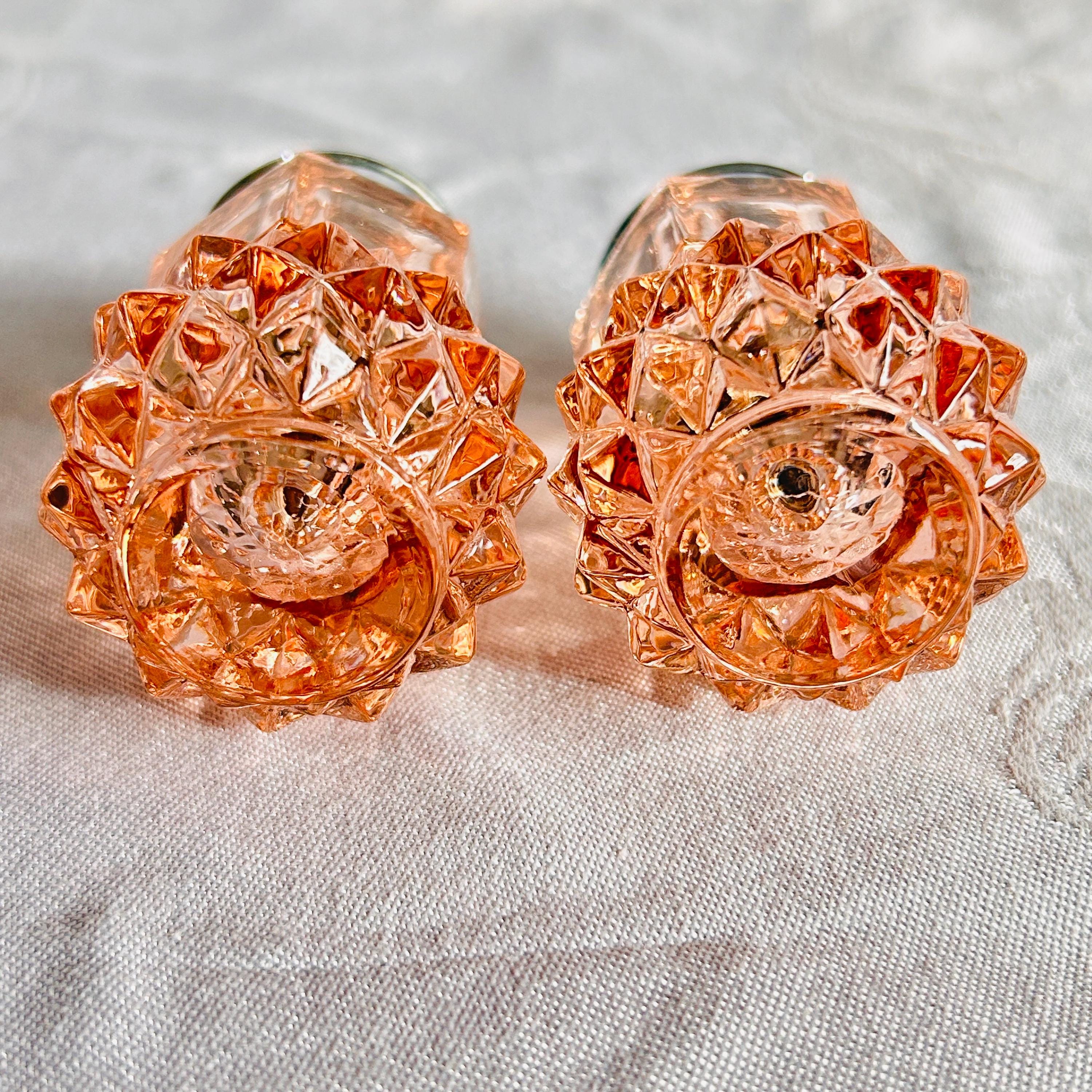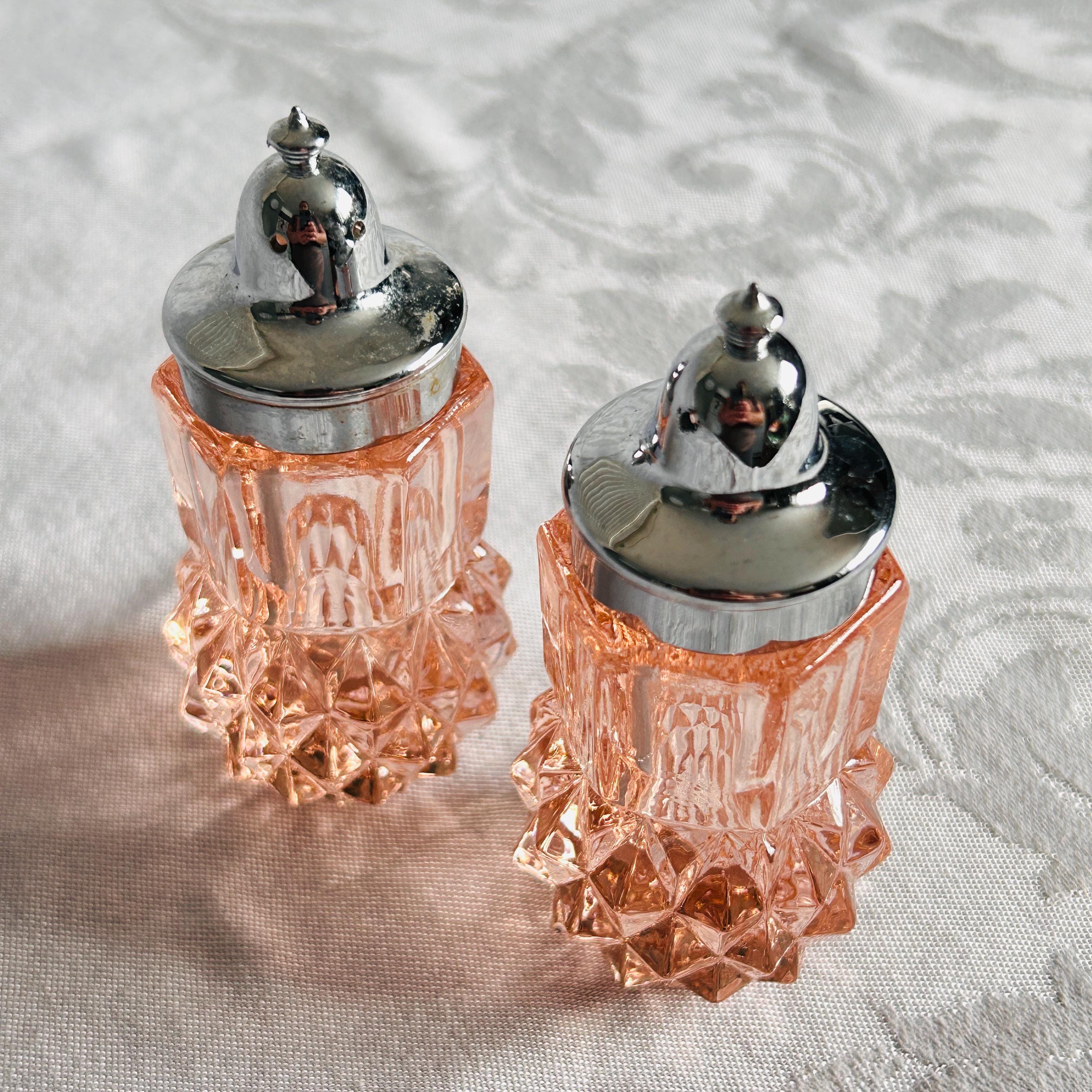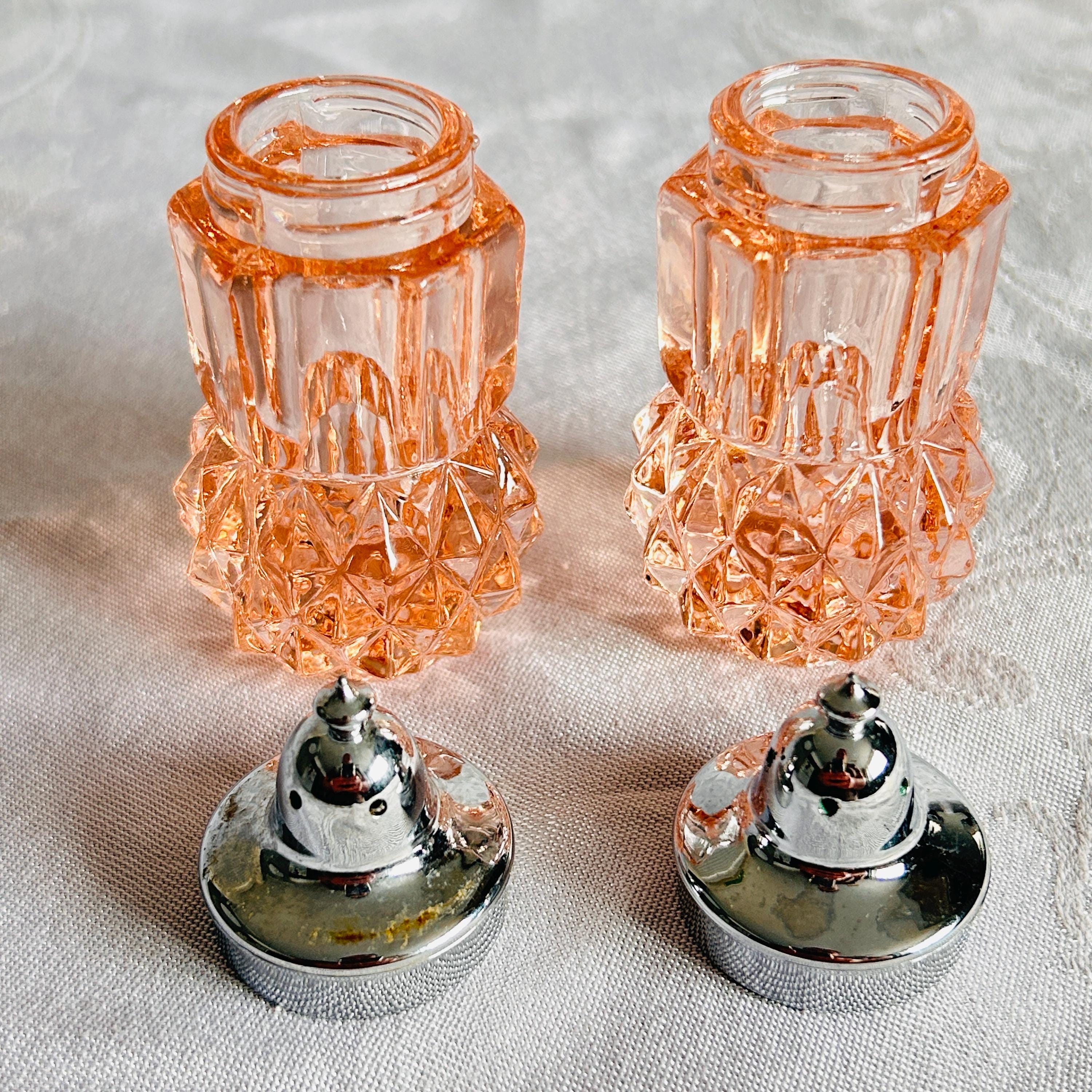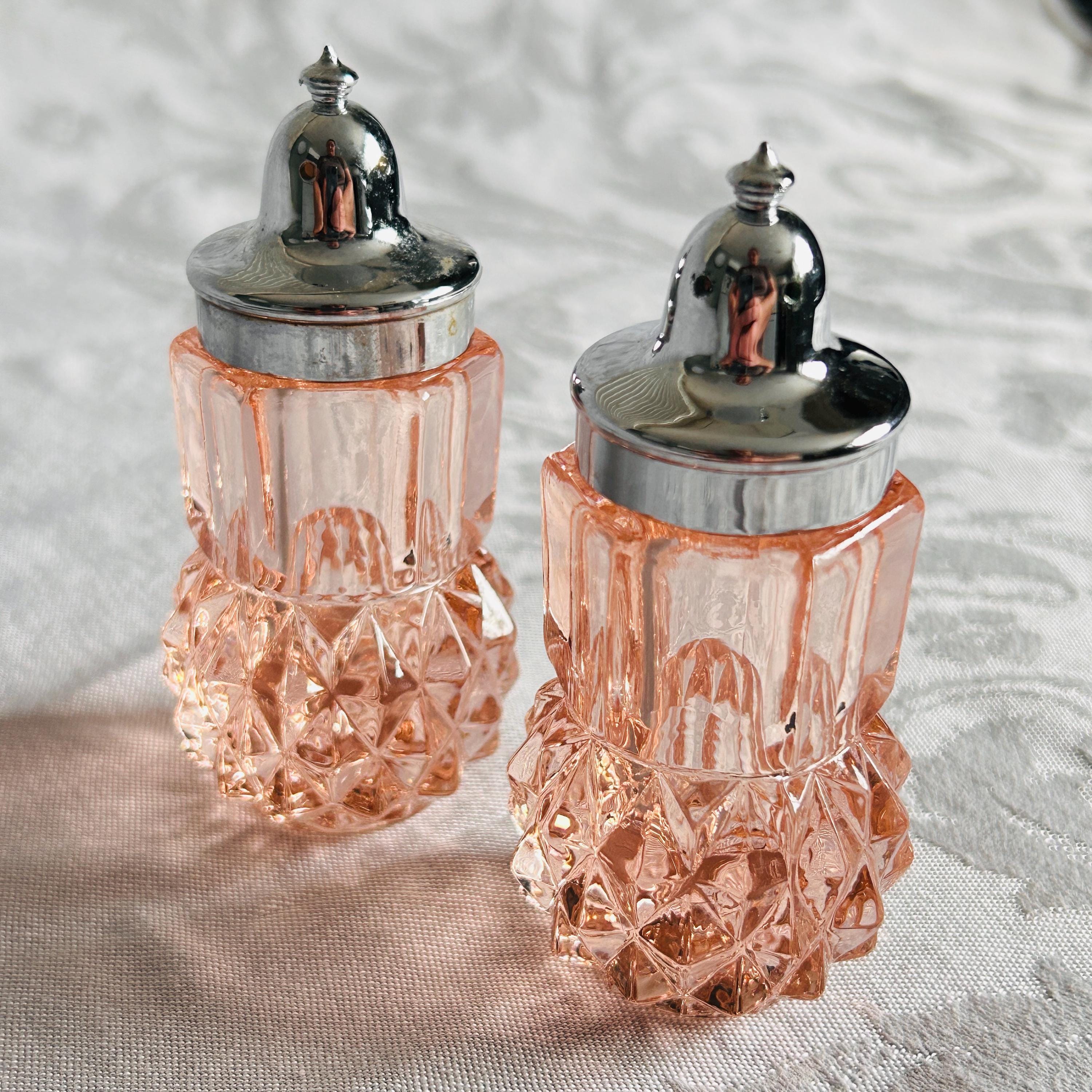 Crafted in the United States, this discontinued pattern features a soft blush-pink hue with a faceted diamond point texture that catches the light beautifully. The shakers are topped with classic chrome-plated lids, adding a timeless contrast to the delicate glass.
