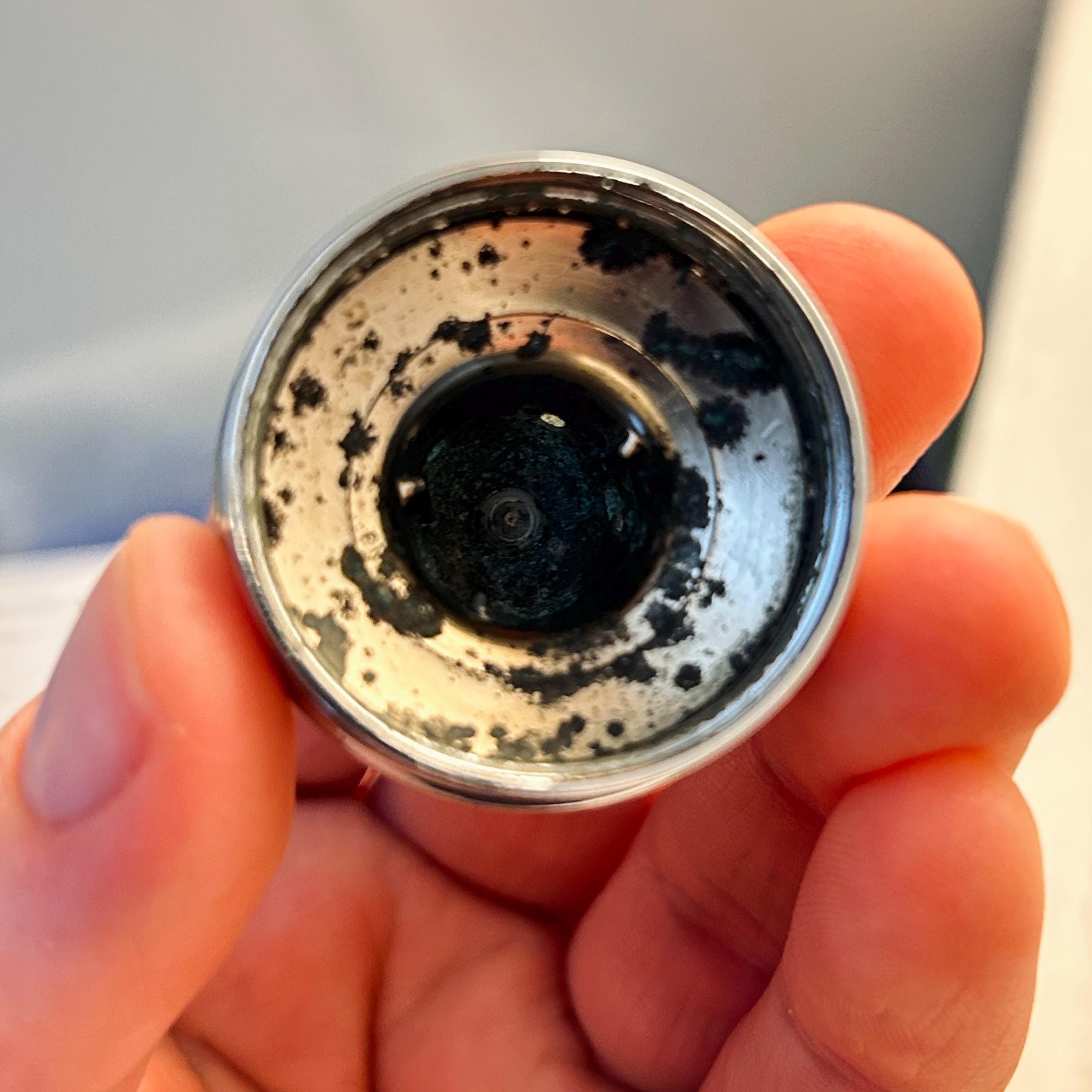 There is visible tarnish to the interior of one lid, consistent with age and typical use, which remains after cleaning. This does not affect functionality and is not visible when the shaker is in use or on display.