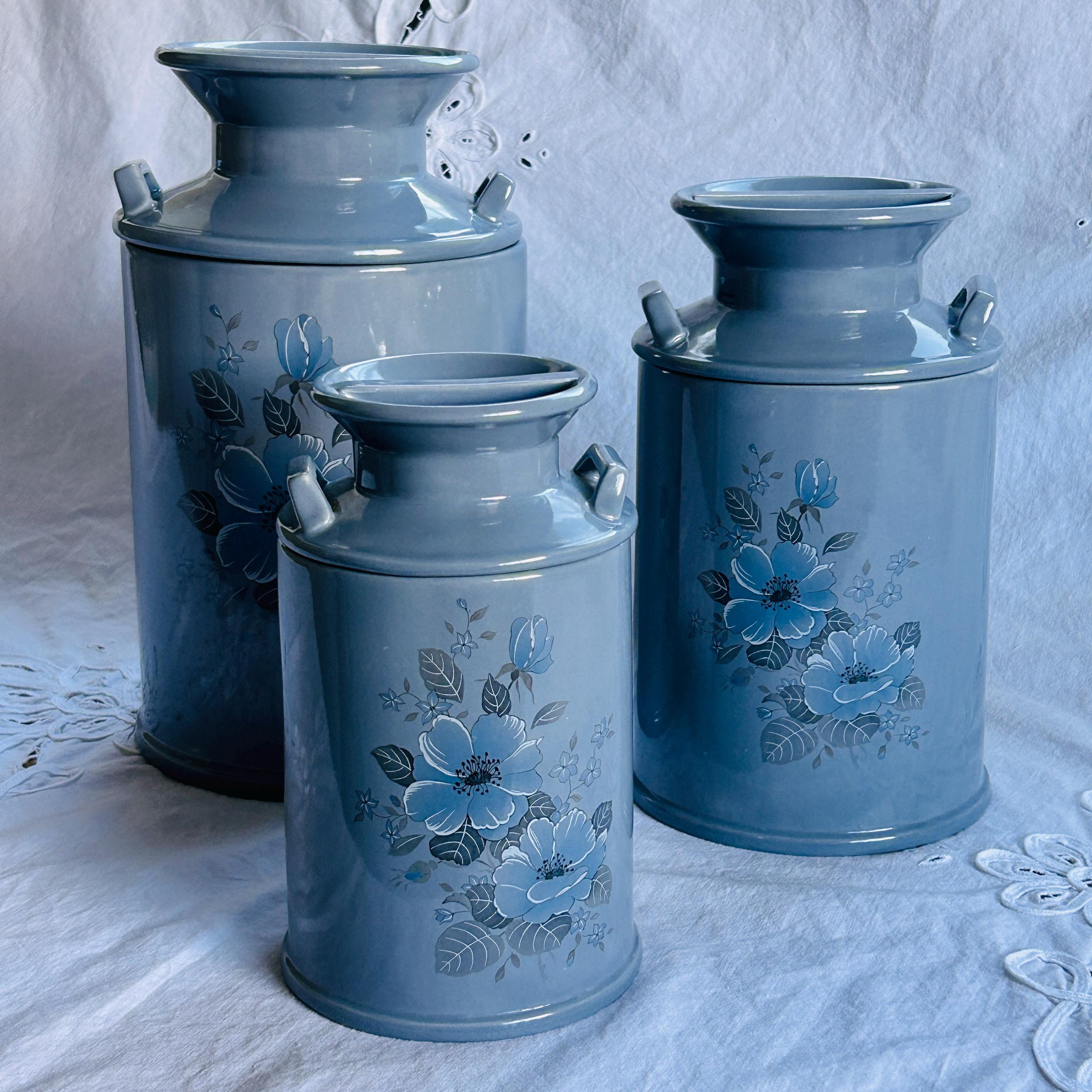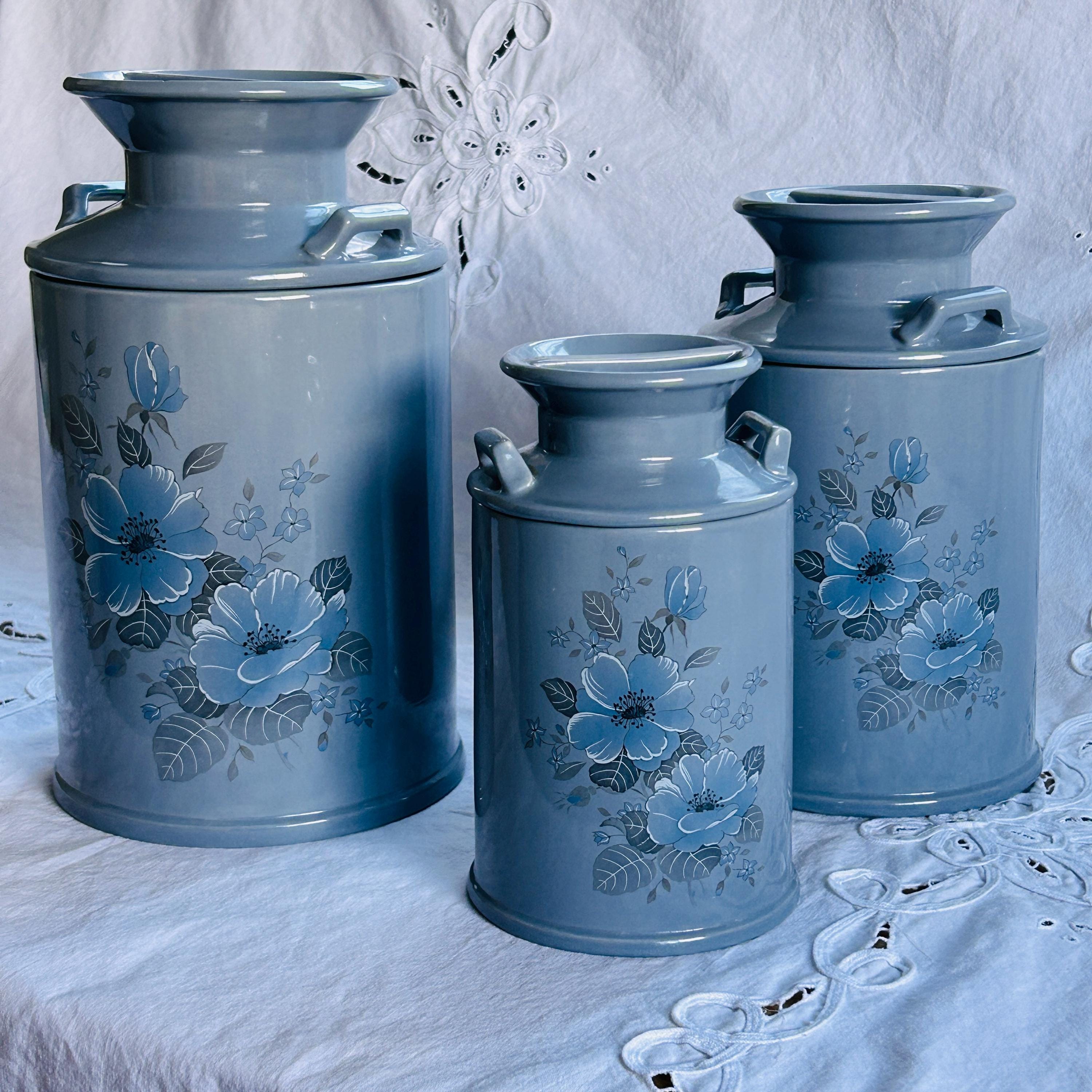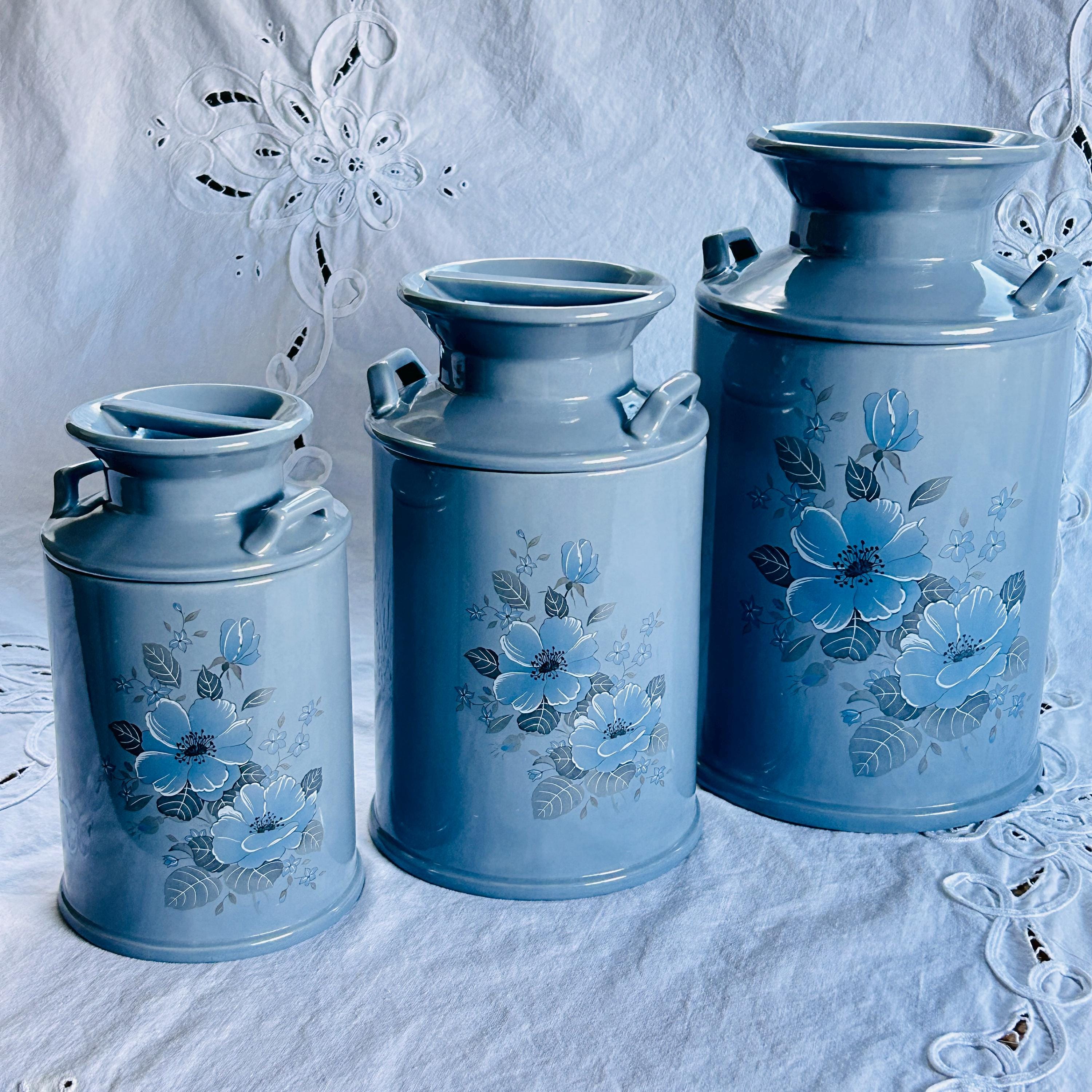 Bring the quiet charm of a countryside kitchen into your home with this beautifully coordinated set of three vintage ceramic milk jug canisters—where soft powder blue tones and delicate floral details create a look that feels both timeless and effortlessly lived-in. Reminiscent of a sunlit farmhouse pantry, this vintage canister set blends cottagecore warmth with classic kitchen storage appeal.