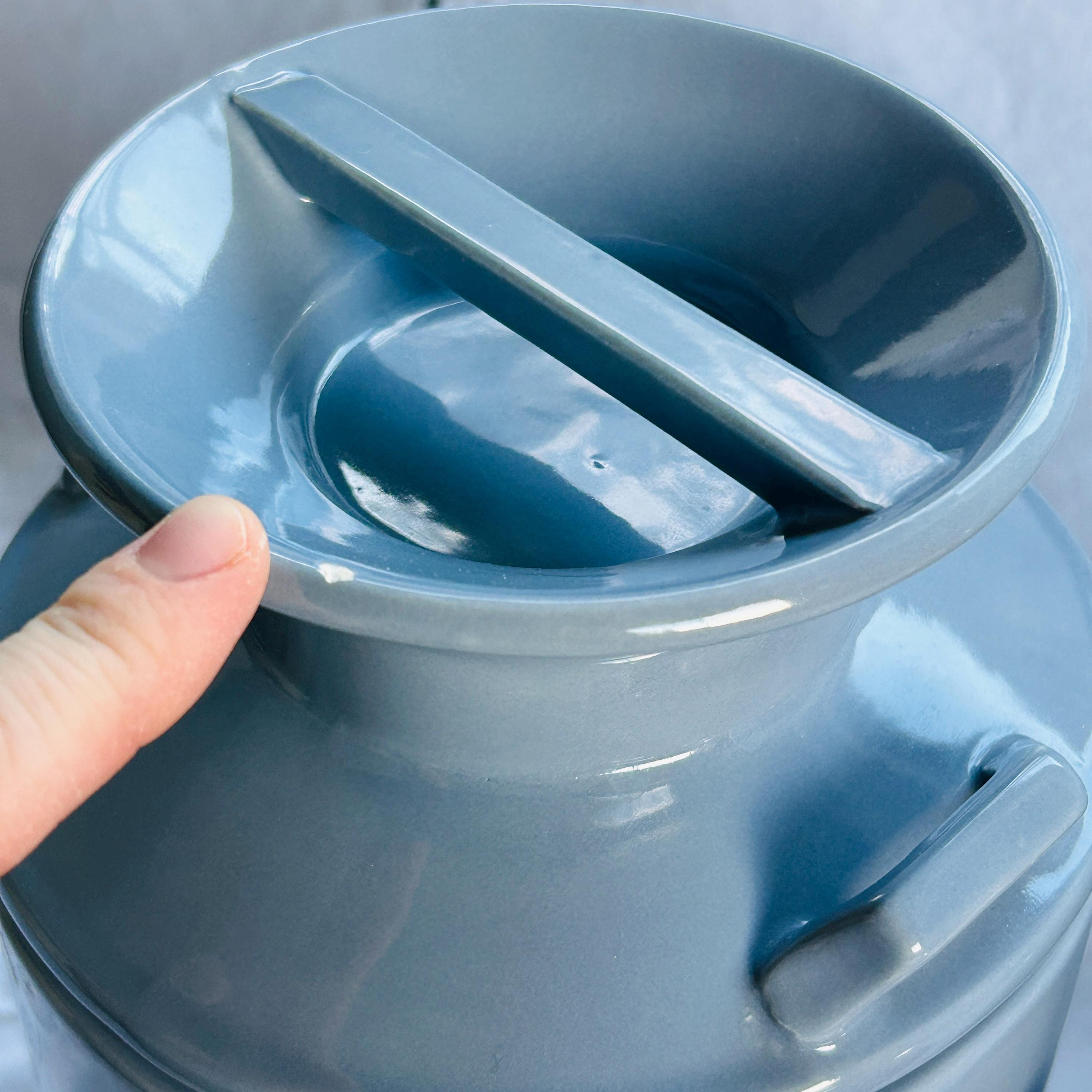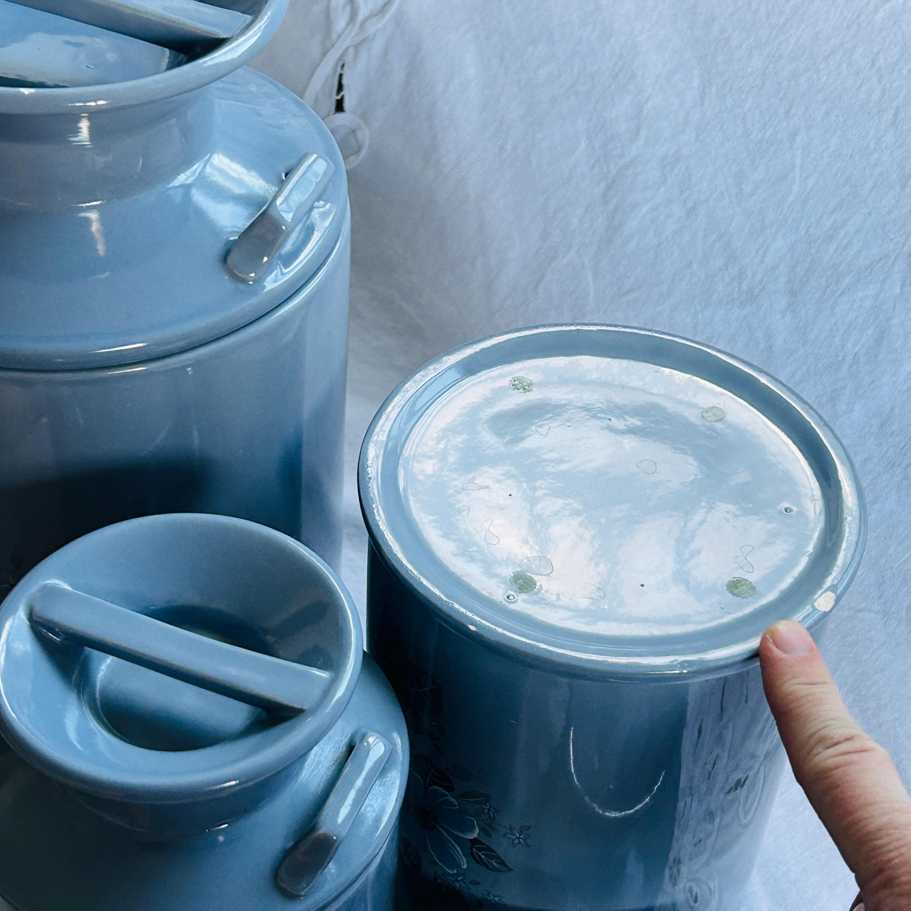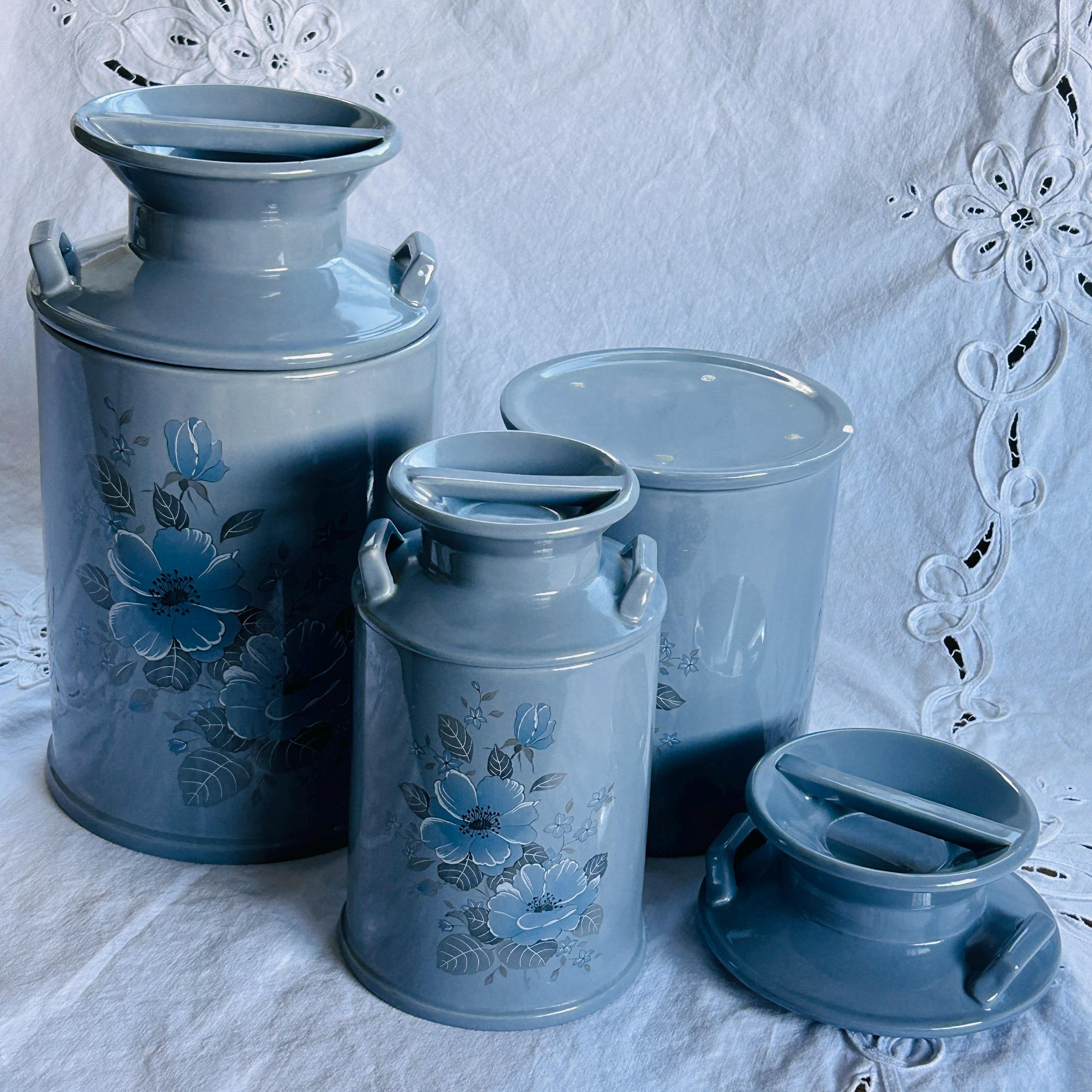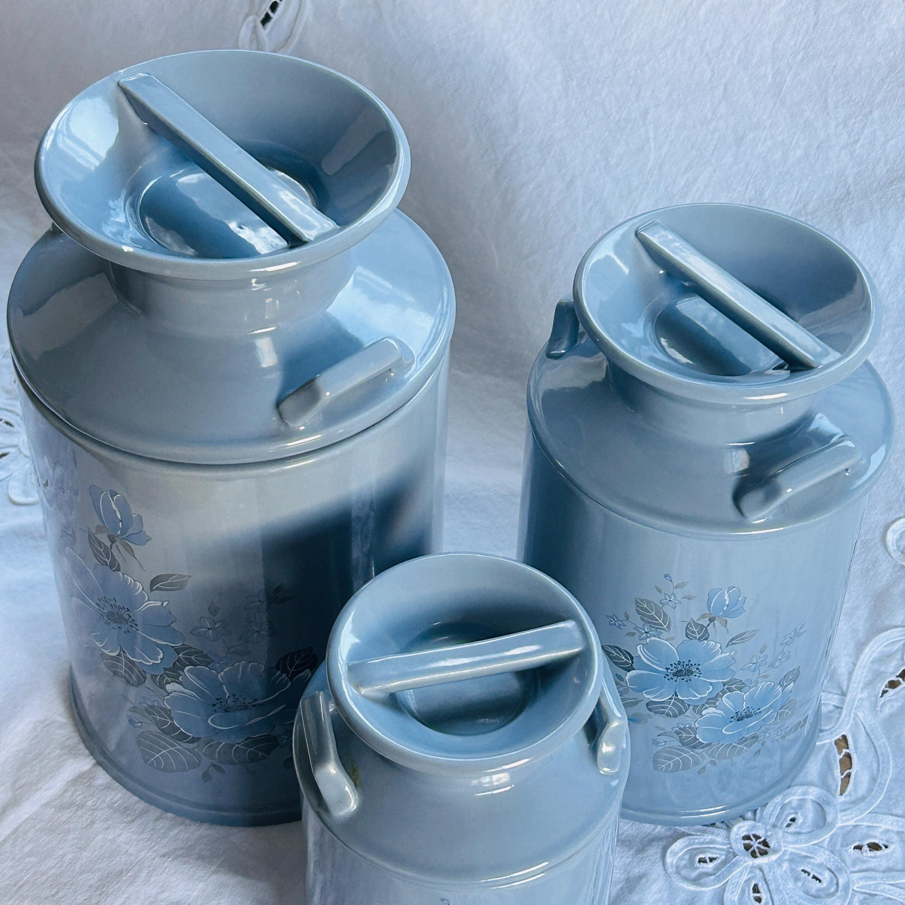 Bring the quiet charm of a countryside kitchen into your home with this beautifully coordinated set of three vintage ceramic milk jug canisters—where soft powder blue tones and delicate floral details create a look that feels both timeless and effortlessly lived-in. Reminiscent of a sunlit farmhouse pantry, this vintage canister set blends cottagecore warmth with classic kitchen storage appeal.