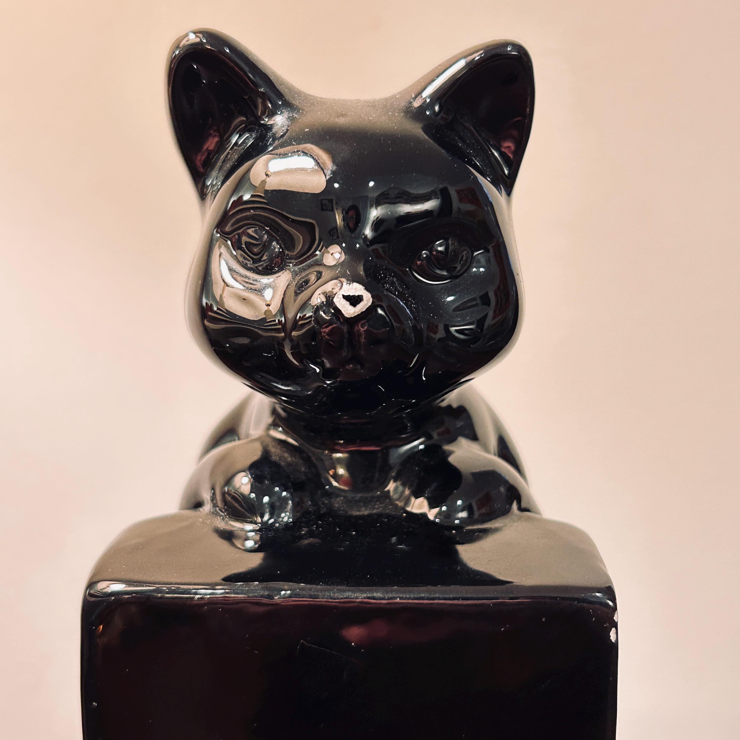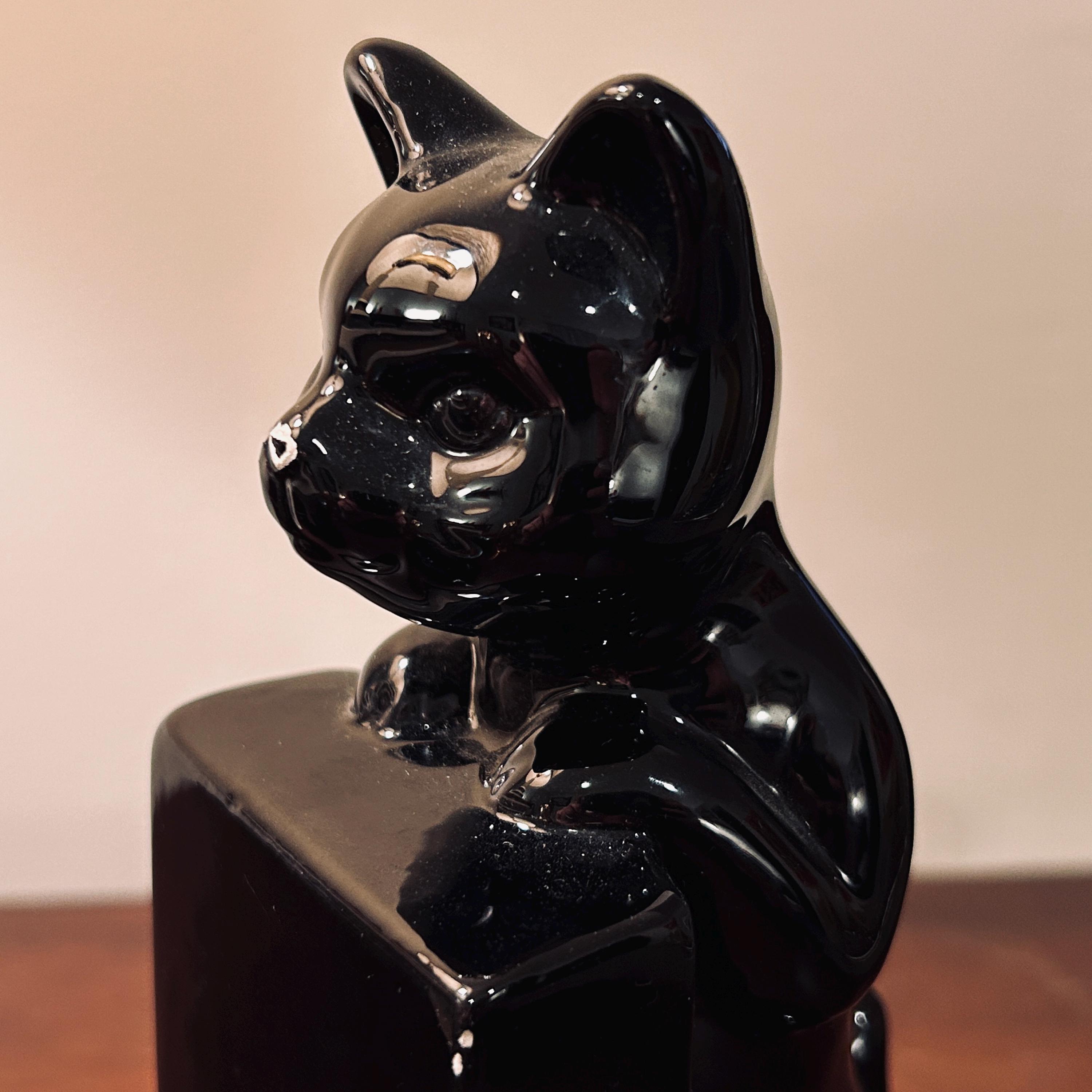 • Glossy black cat form with sculptural presence