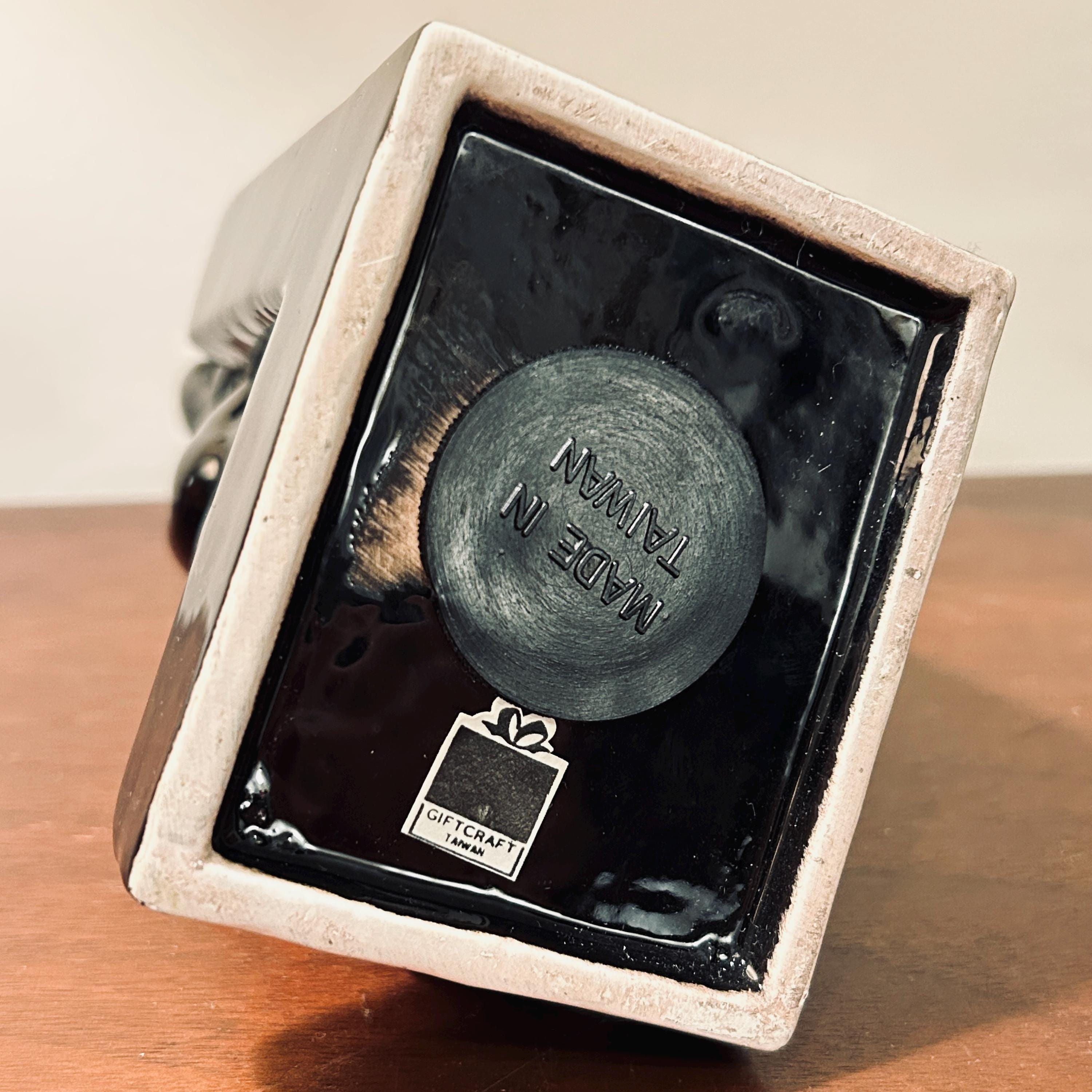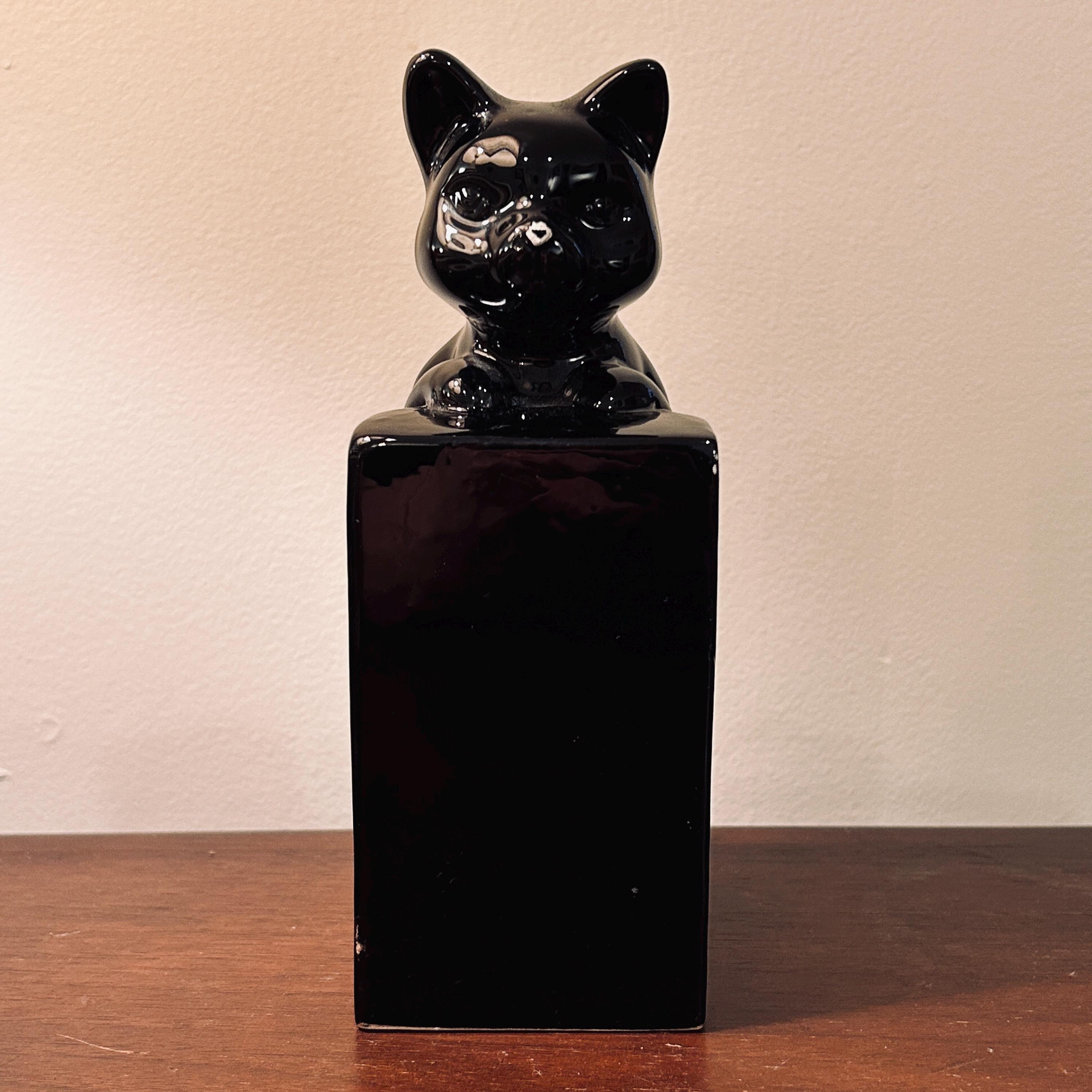 A charming and quietly enigmatic vintage ceramic black cat bookend by Giftcraft, finished in a rich, high-gloss glaze that reflects light beautifully from every angle. With its upright posture and simplified features, this piece carries a subtle, watchful presence—less ornamental, more sculptural—making it a distinctive accent for a shelf, bookcase, or curated vignette.