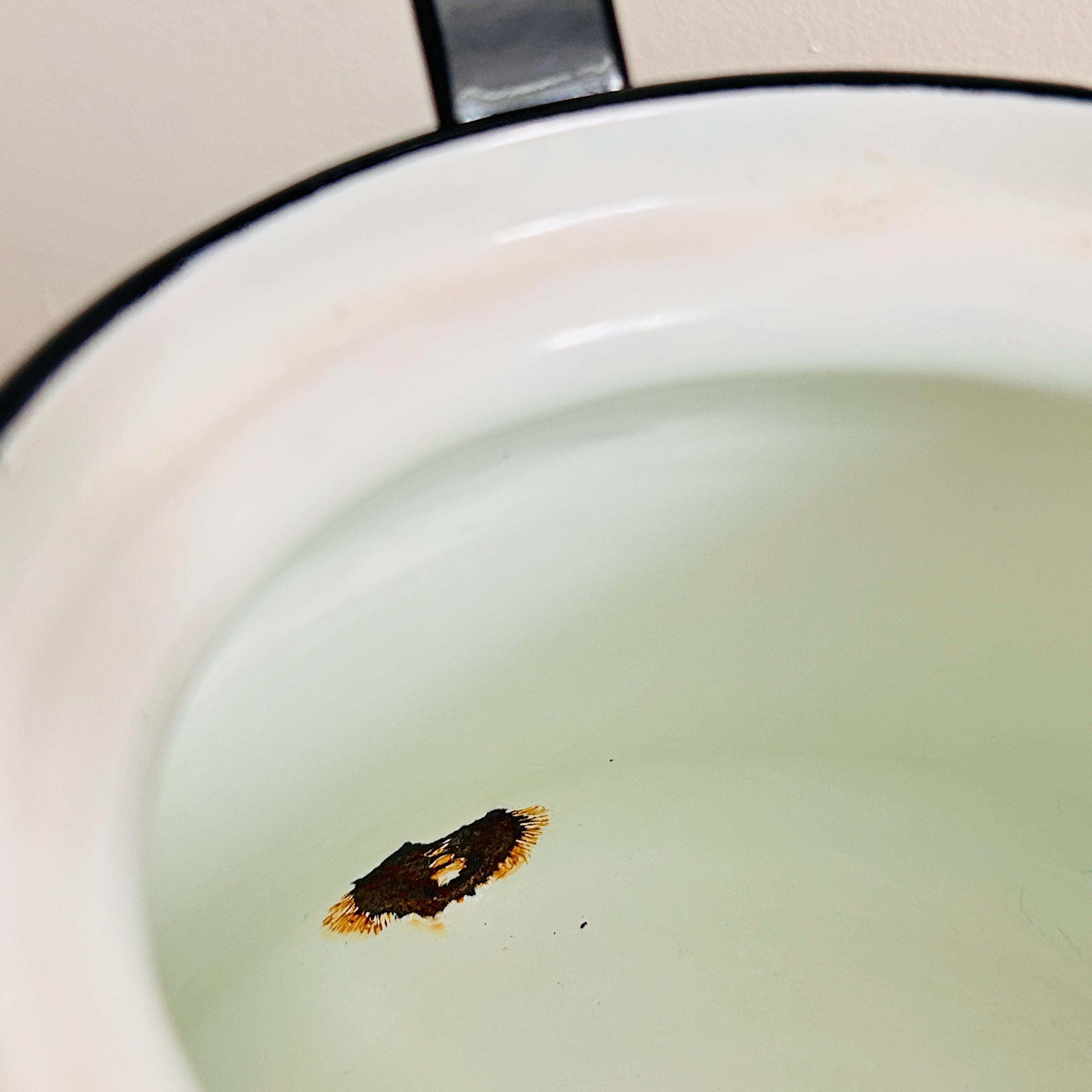 Notable enamel loss is present on the lower exterior of the kettle, with corresponding wear visible on the interior. Additional smaller areas of enamel wear are present along the lid edge. These condition details have been clearly photographed and are reflected in the pricing. Typical characteristics of vintage enamelware may also be present, including minor surface variations from the original manufacturing process.
