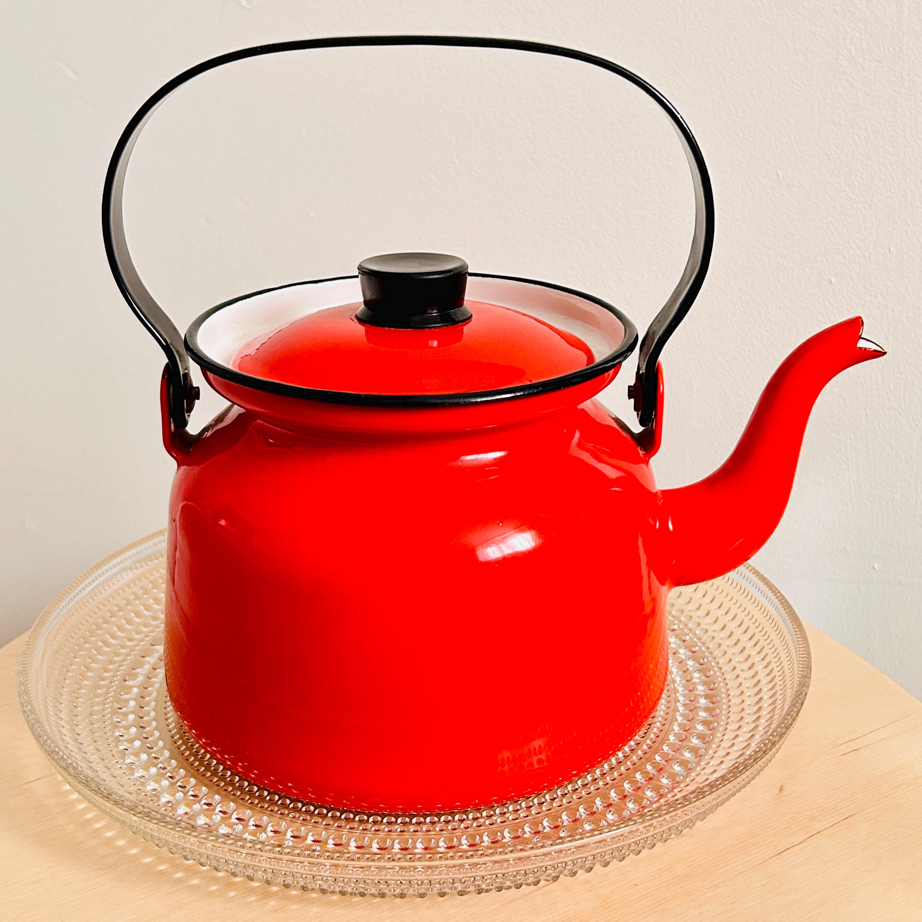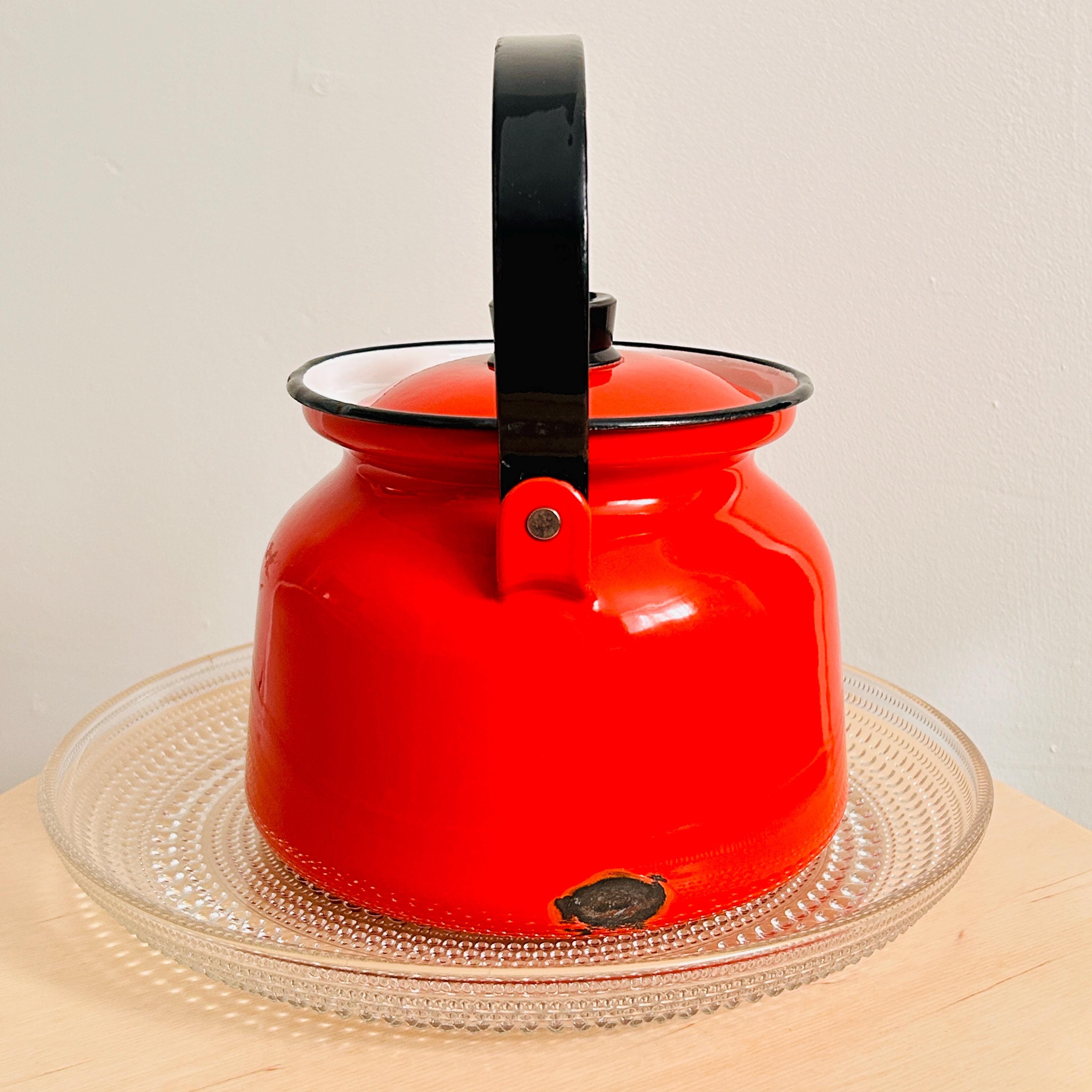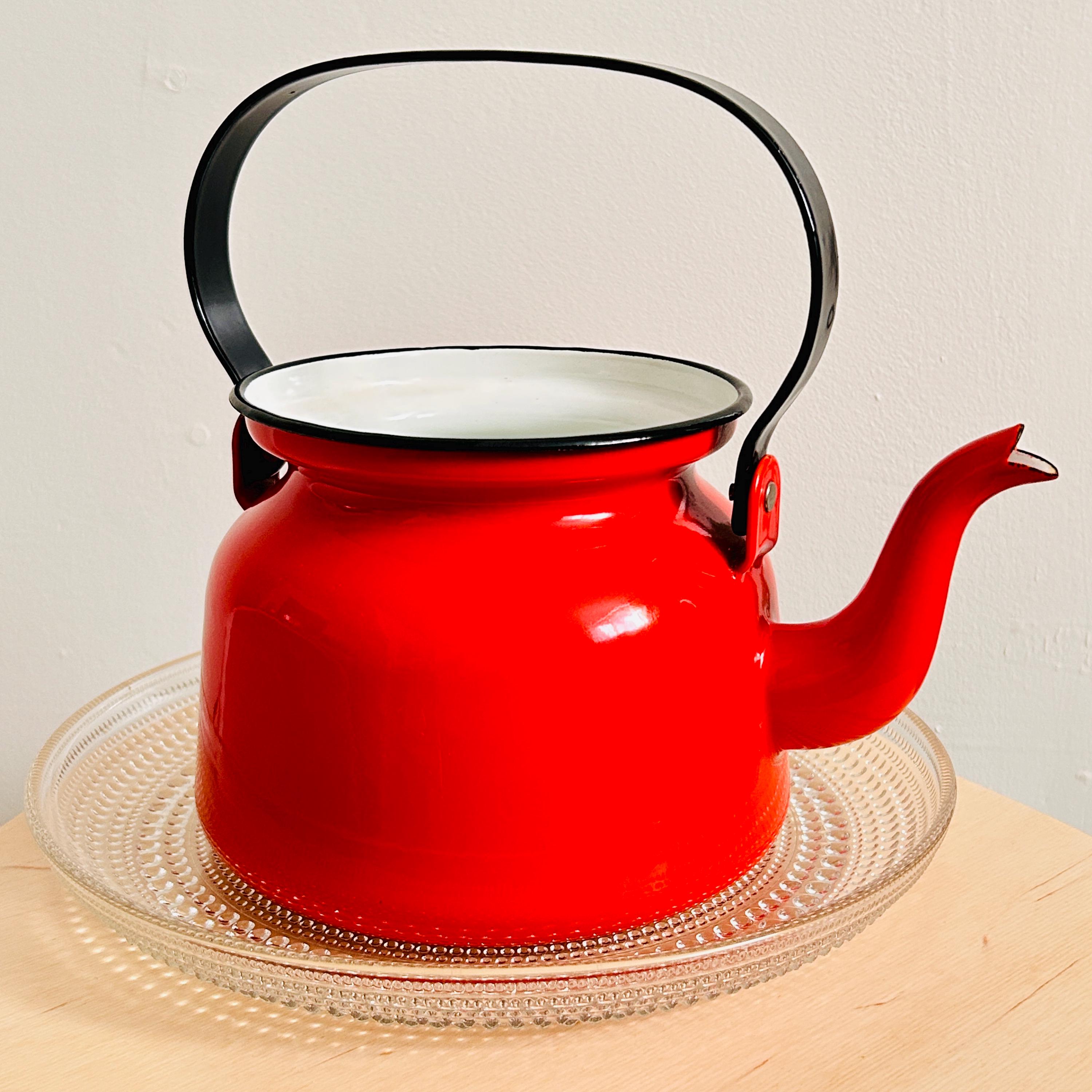 With its sculptural silhouette, gently curved spout, and striking enamel finish, this kettle offers a vivid pop of color and form. The contrast of the glossy red body with black accents creates a visually grounded yet energetic presence, making it equally at home on open shelving, a styled vignette, or as a focal point in a curated kitchen display.