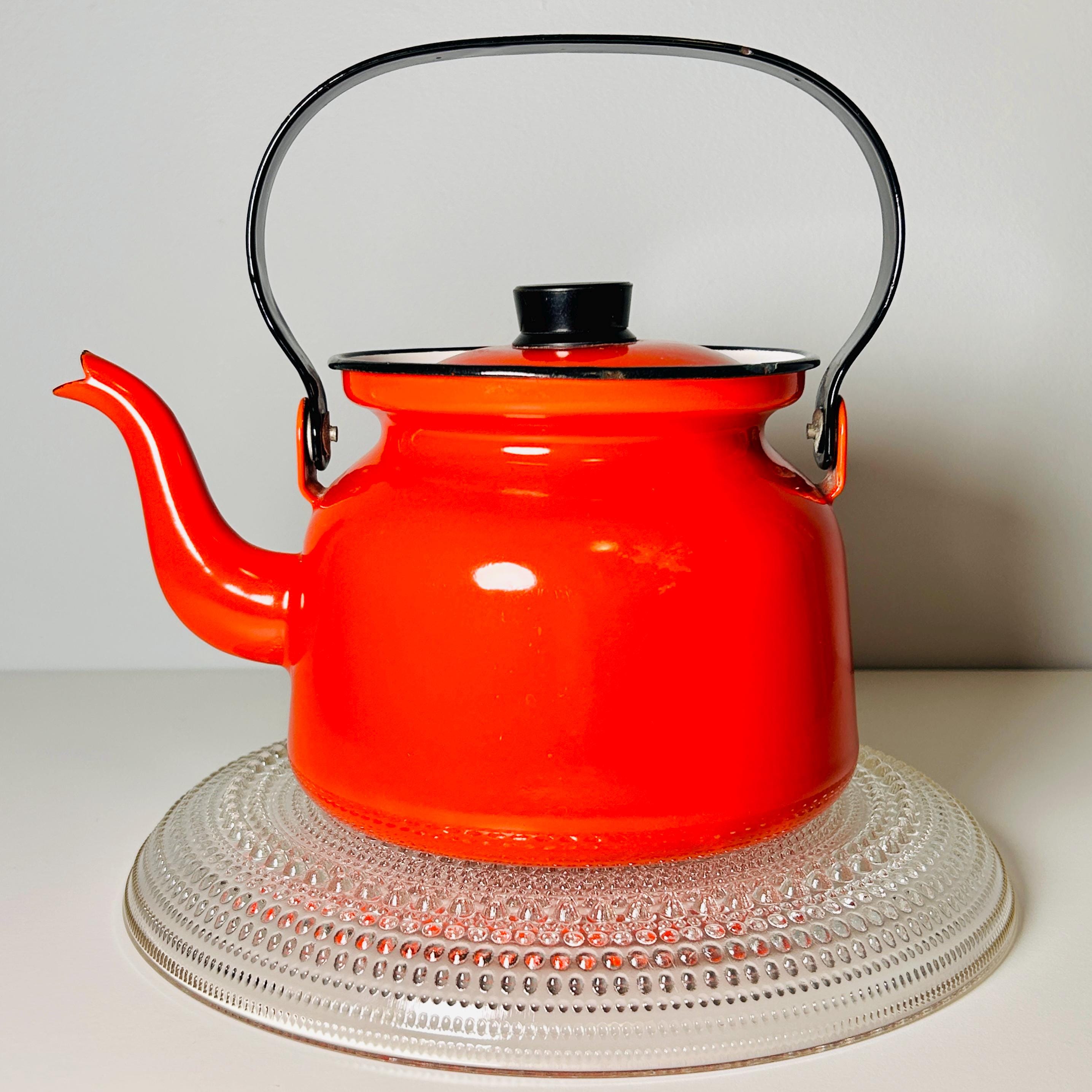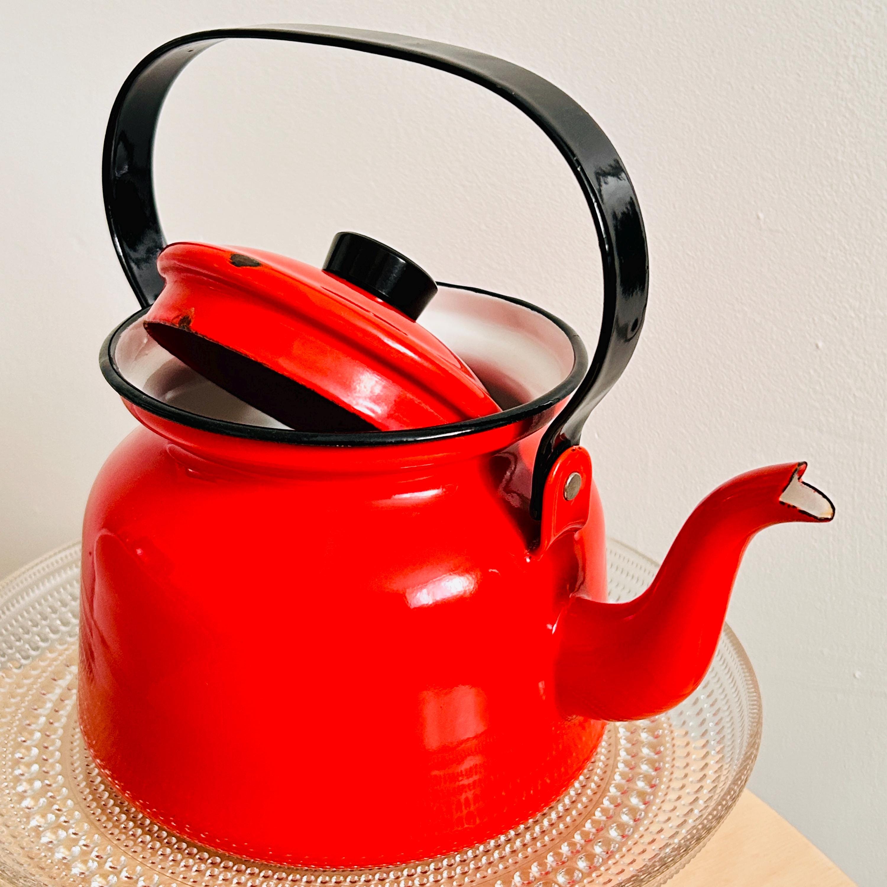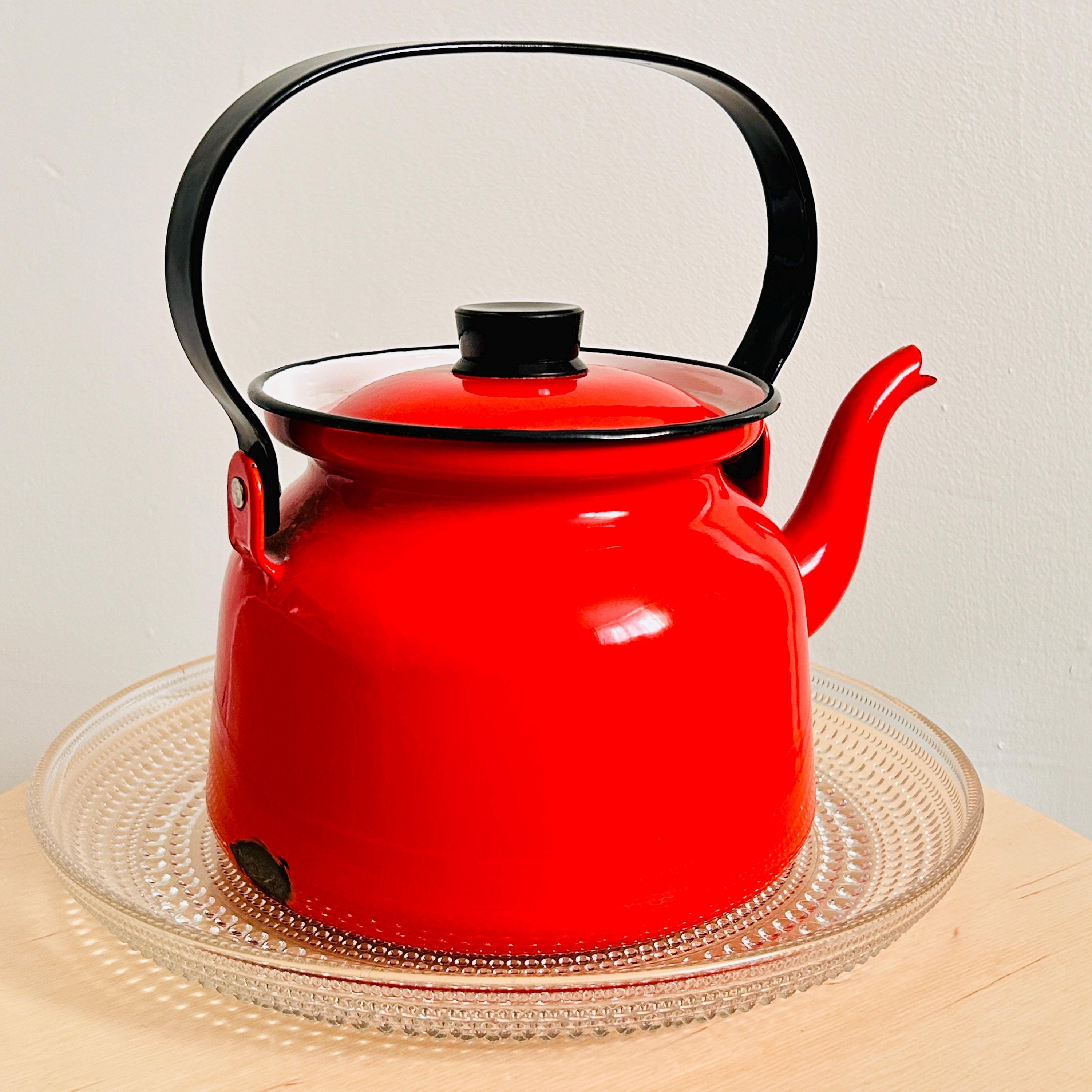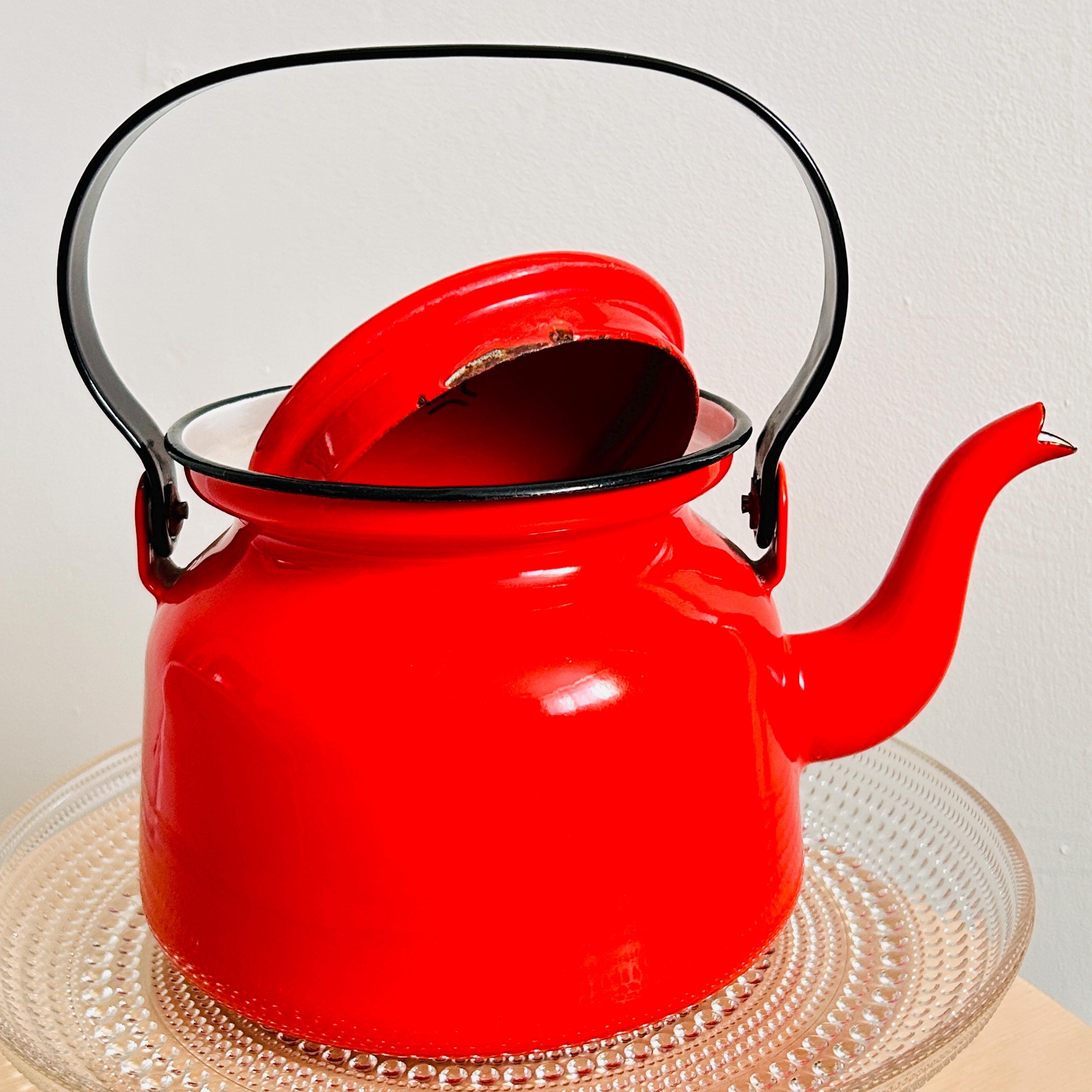 With its sculptural silhouette, gently curved spout, and striking enamel finish, this kettle offers a vivid pop of color and form. The contrast of the glossy red body with black accents creates a visually grounded yet energetic presence, making it equally at home on open shelving, a styled vignette, or as a focal point in a curated kitchen display.